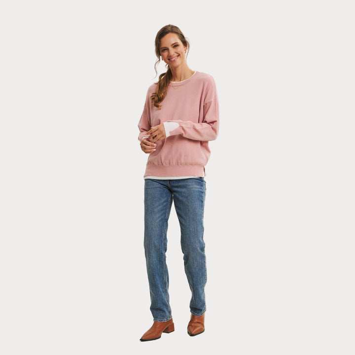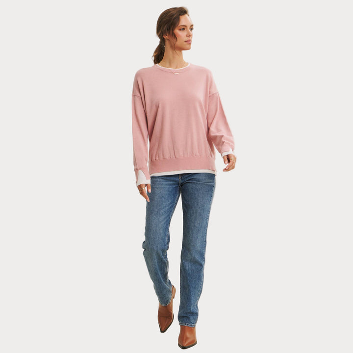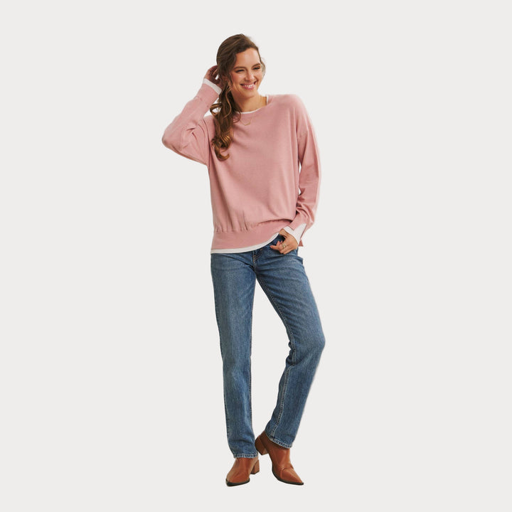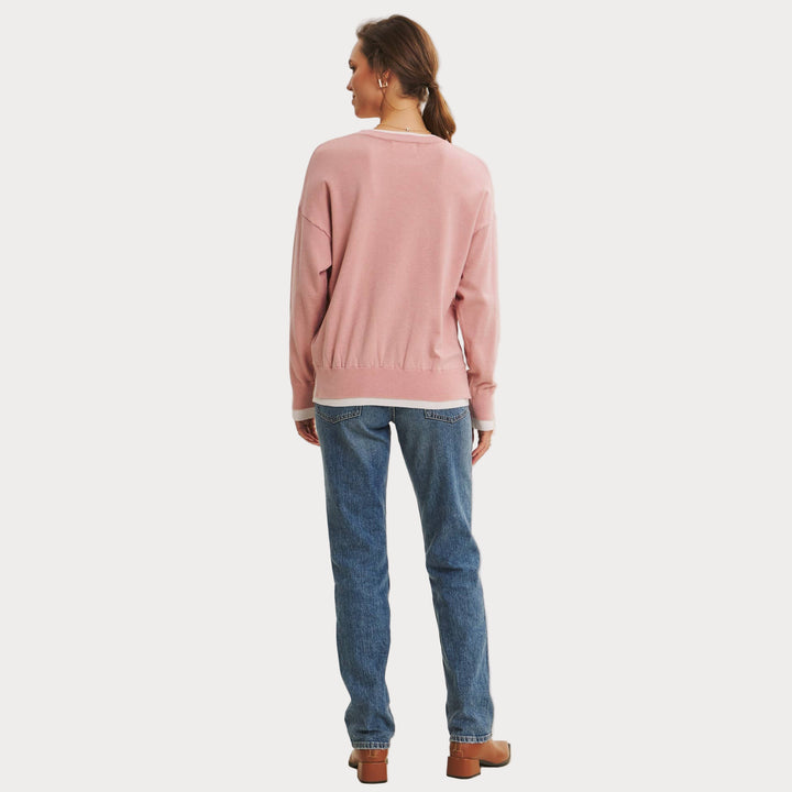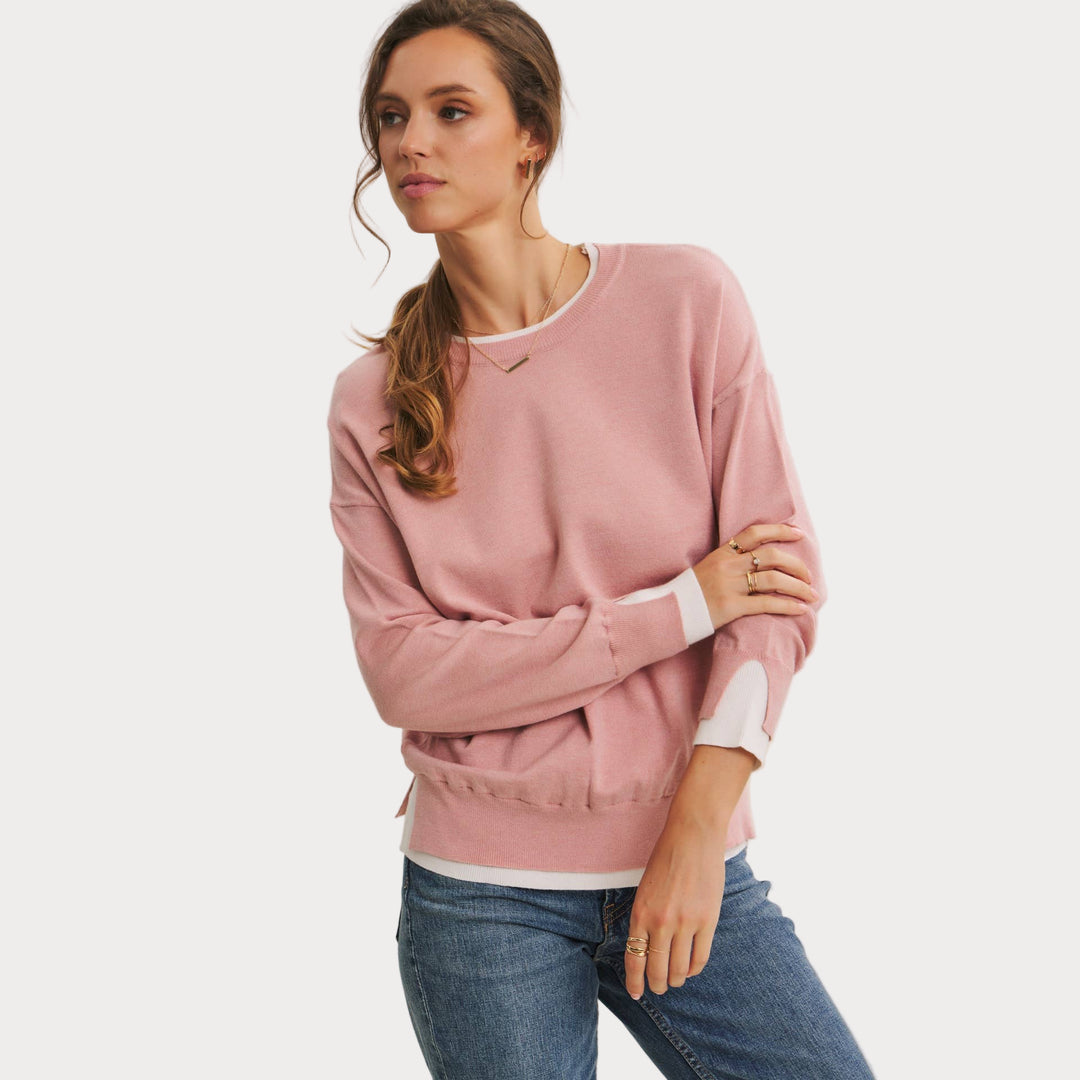 The two-tone detail at the neckline and cuffs adds a touch of modern contrast, making this piece easy to style with denim, skirts, or trousers. Lightweight yet cozy, it’s the sweater you’ll reach for season after season.