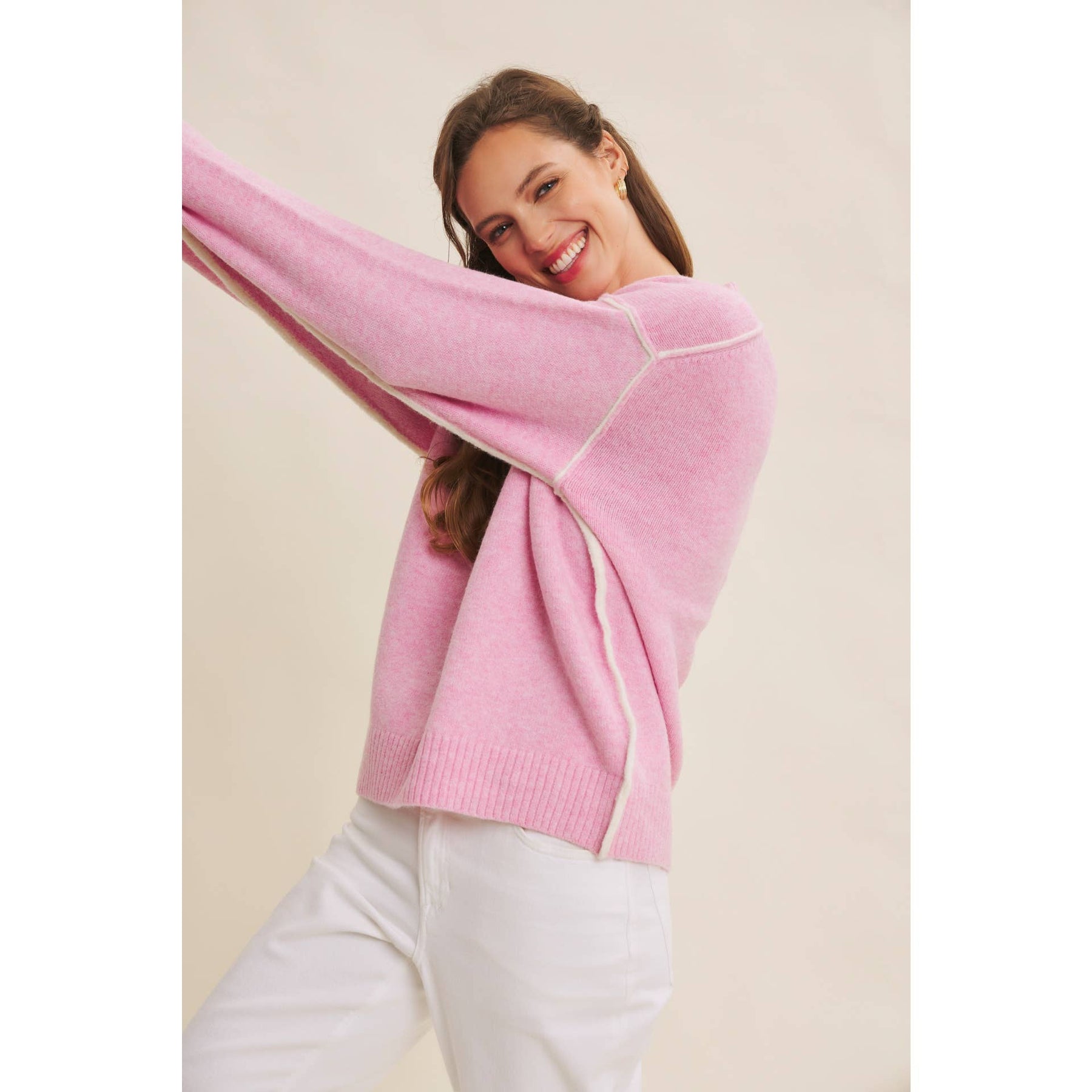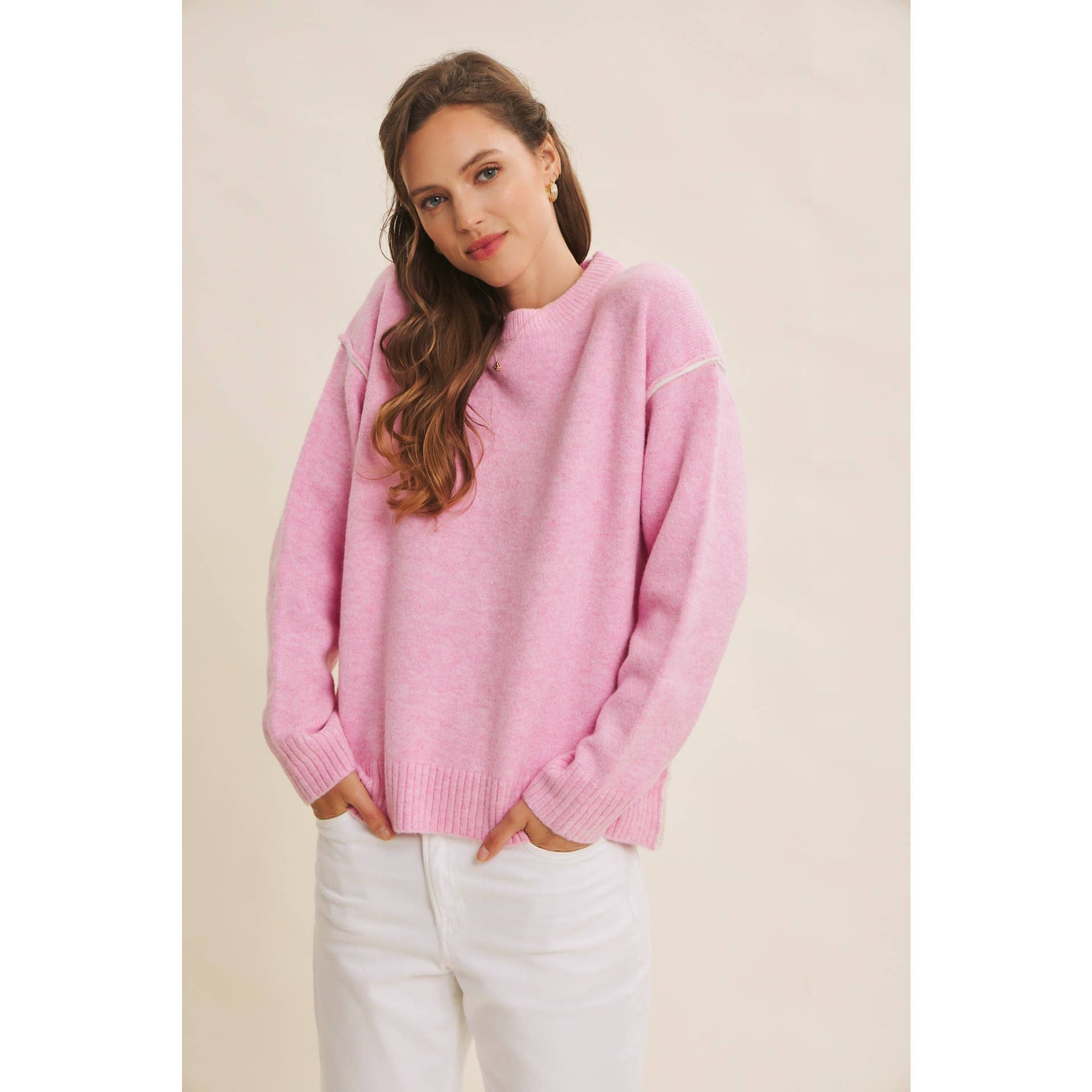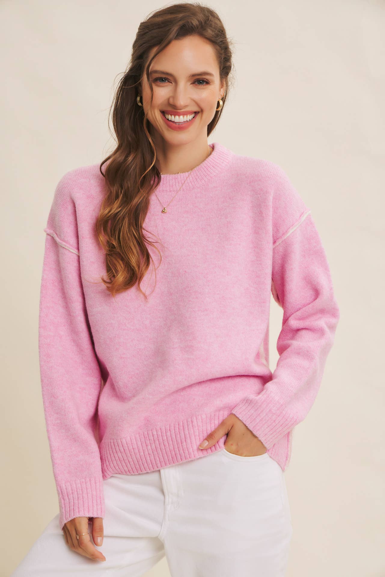 Say hello to happy layers. This ultra-soft knit sweater arrives in the dreamiest bubblegum pink—a color so fresh and uplifting, it instantly brightens any look. Crafted with sustainability in mind, it's made from a cozy recycled polyester wool blend that’s both luxe and eco-conscious. Thoughtful contrast seam detailing adds subtle definition to the relaxed silhouette, while the ribbed detail finishes it off with polish. The mood? Casual, confident, and joyfully feminine. This is a piece that feels as good as it looks—and as good for the planet as it is for your wardrobe.