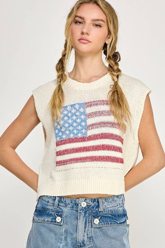 Show off your American pride with our KNIT PULLOVER SWEATER VEST! Made with soft, breathable fabric, this lightweight vest features a unique cap sleeve and crew neck design, with a fun American flag knit pattern. Perfect for any occasion, easily pair with a shirt and jeans for a casual look or dress it up with boots. Don't miss out on this festive piece!