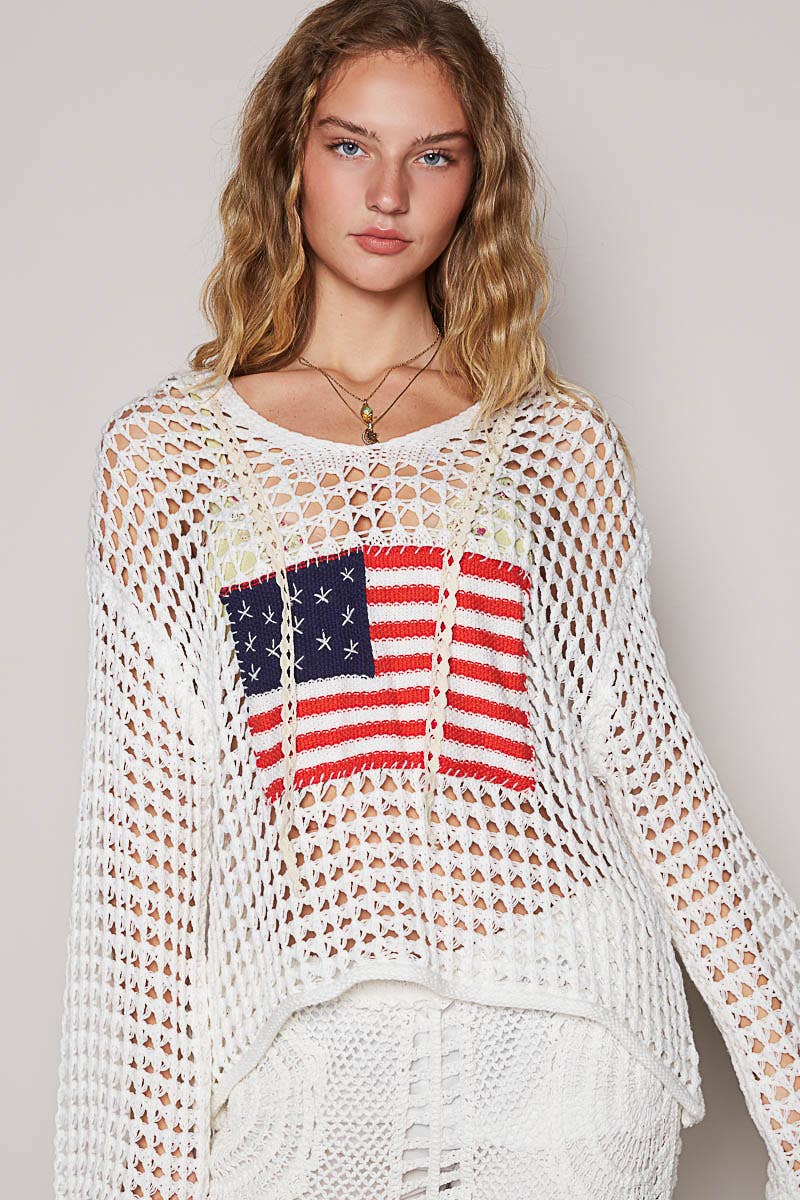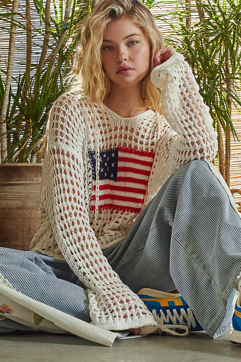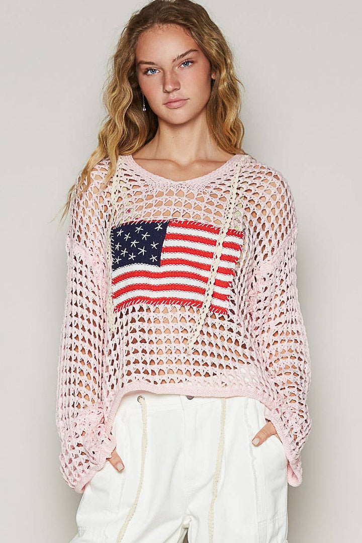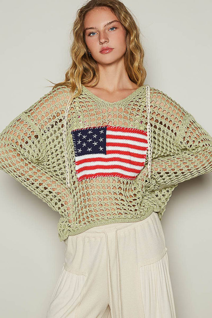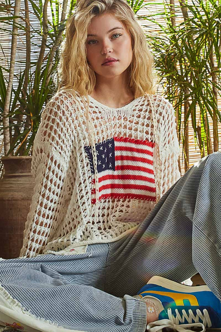 This sweater is a celebration of all things American. Show off your patriotic side with the American flag design, while enjoying the comfort and quality of the V-neck, long sleeve, and regular fit. Plus, the unique stitch point and rolling edge details add a touch of individuality. With a trim loop and solid color, this hoodie sweater is the perfect way to stay cozy and stylish.
