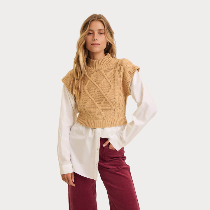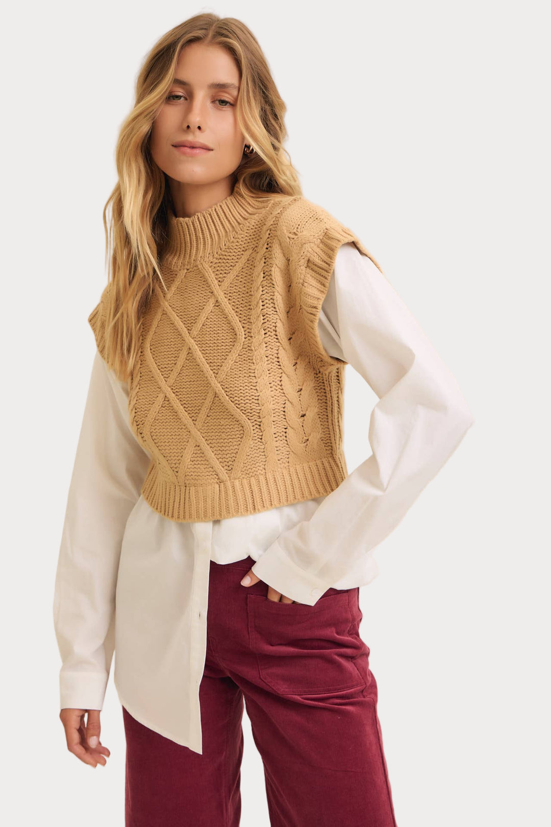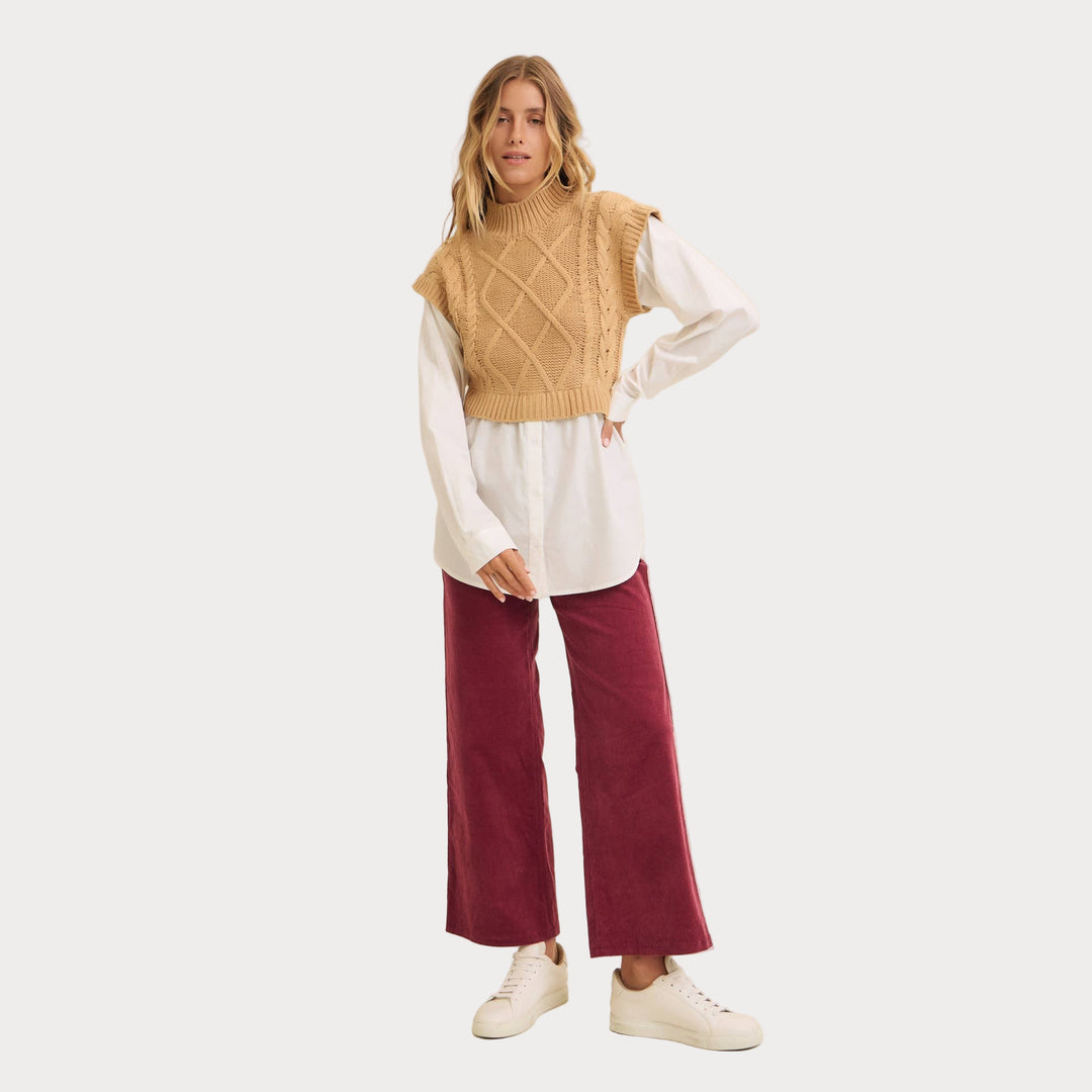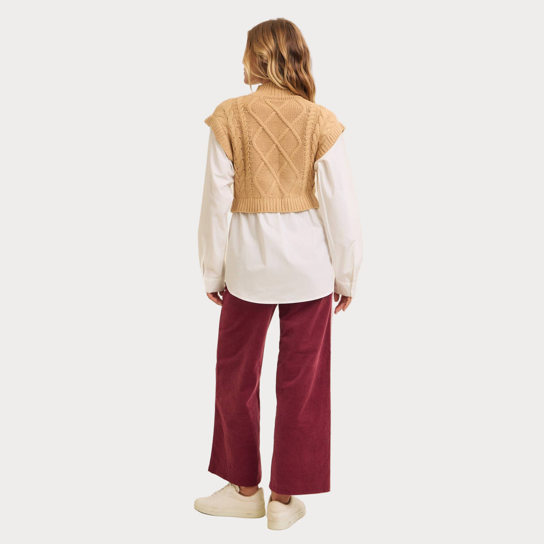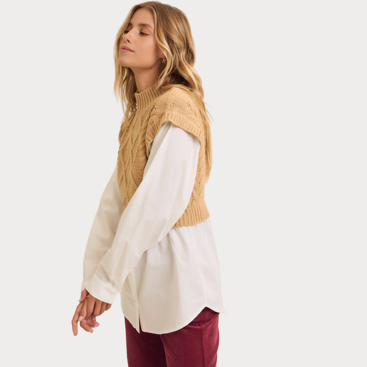 Elevate your wardrobe with the Mock Neck Sweater featuring a stylish contrast button-down shirt. This versatile piece combines a comfortable cable knitted sweater with a chic button-down for a sophisticated layered look.