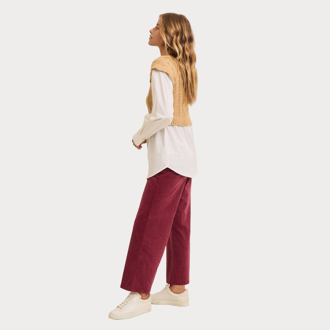 A woman wearing a beige mock neck sweater with a button-down shirt layered underneath, paired with red pants.