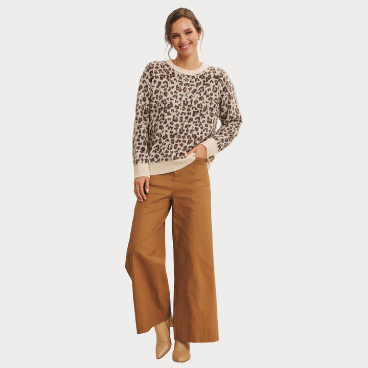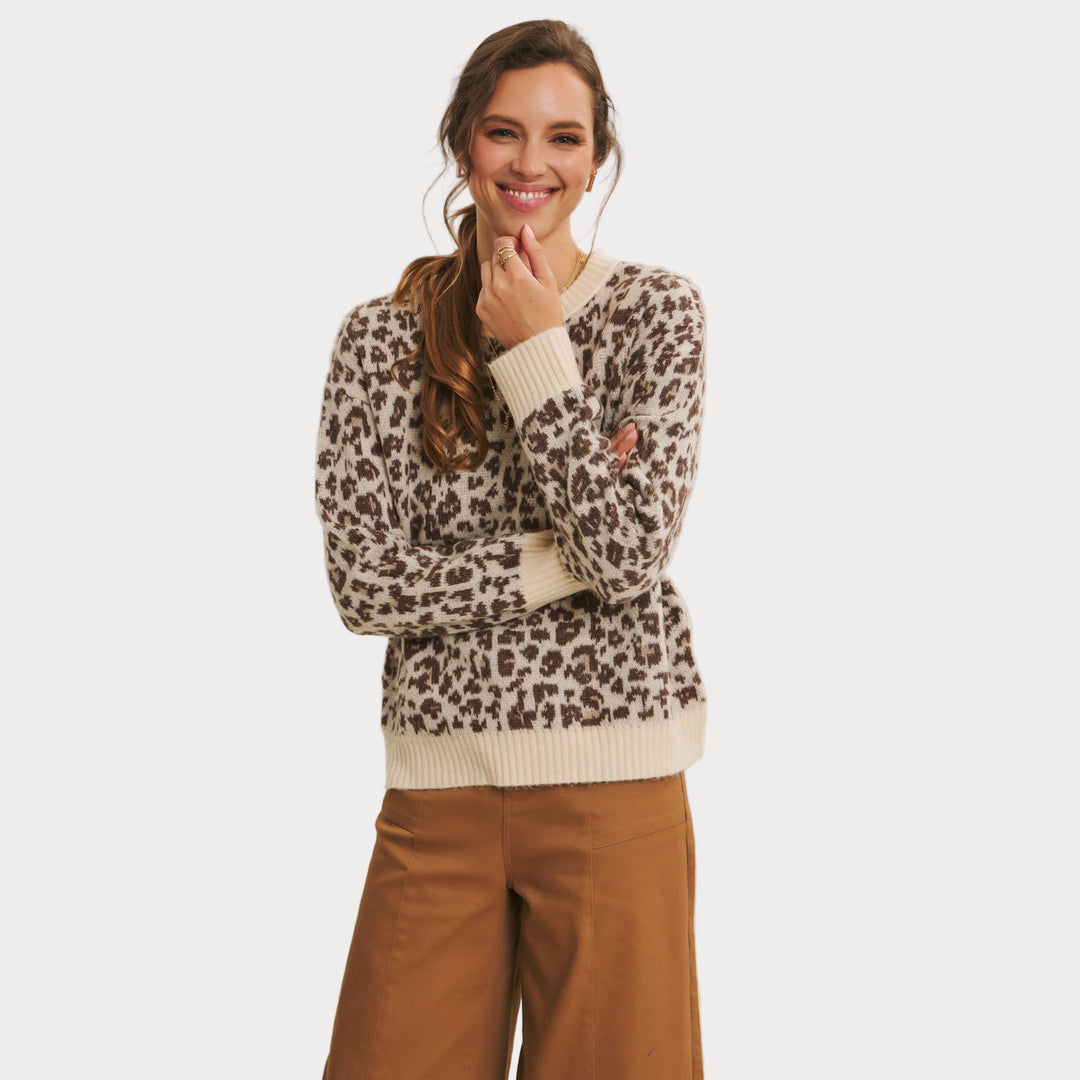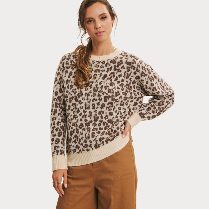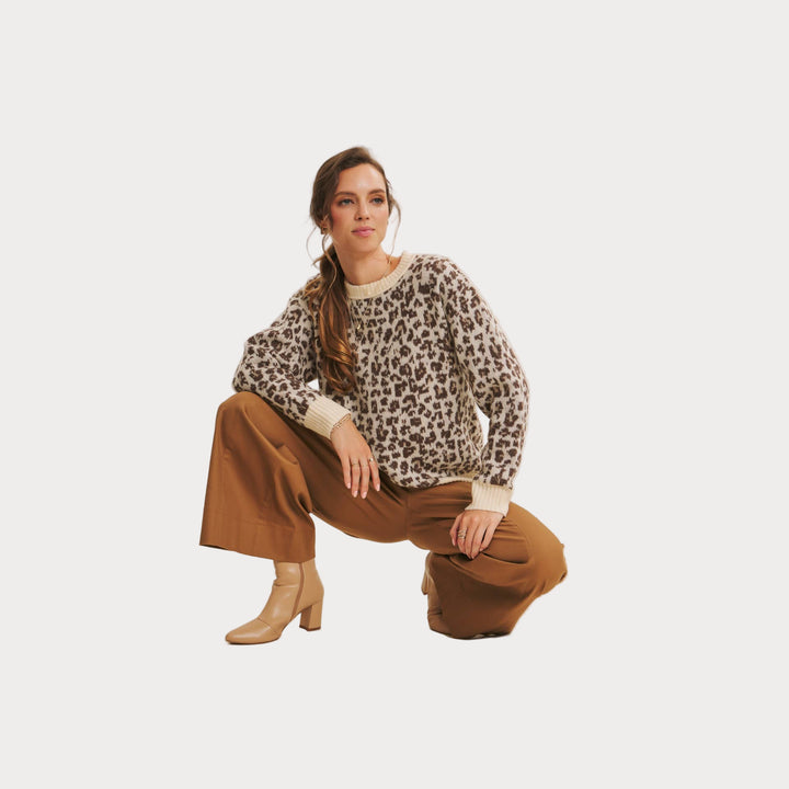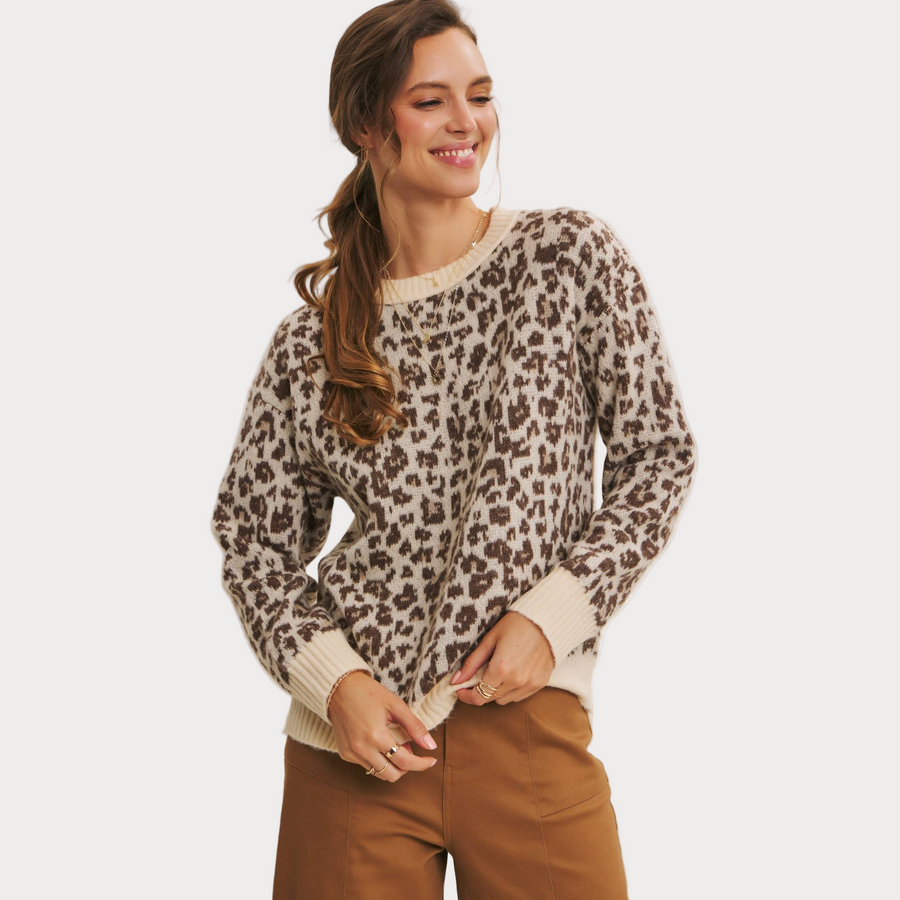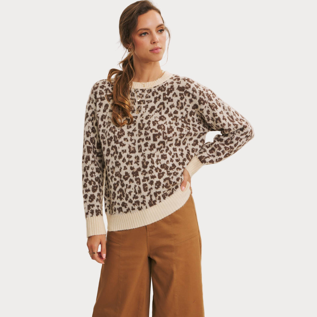 Add a touch of wild charm to your wardrobe with this cozy leopard print sweater. Crafted from soft polyester knit, it features a relaxed fit with ribbed cuffs and hem for everyday comfort. The neutral-toned animal print makes it a versatile statement piece that pairs effortlessly with denim, trousers, or skirts.