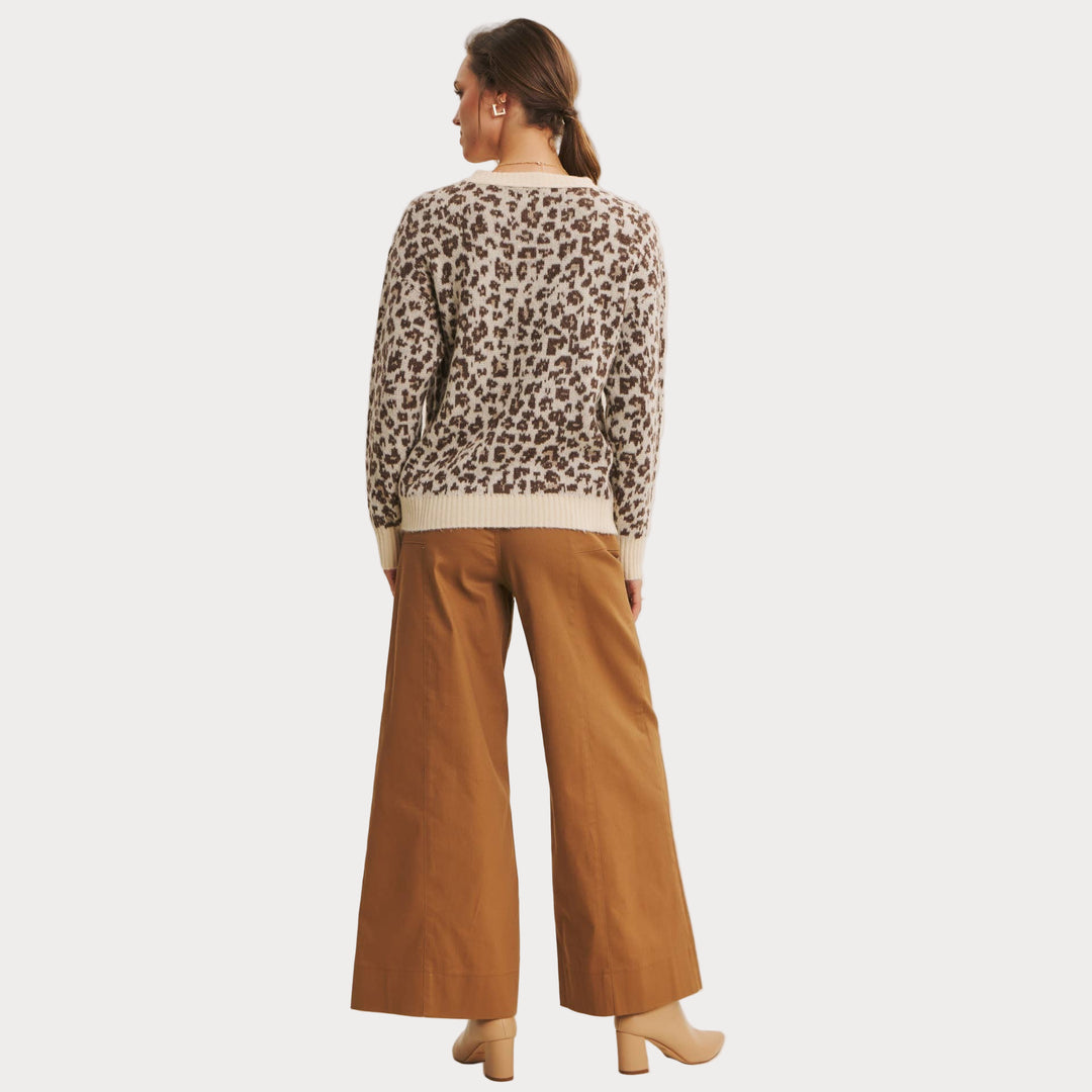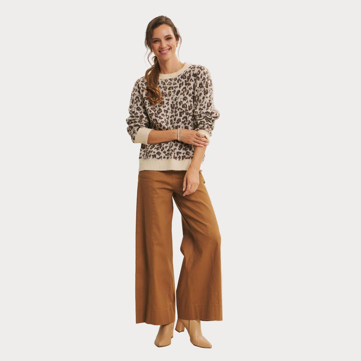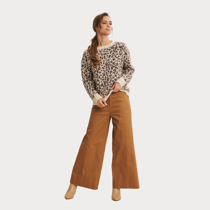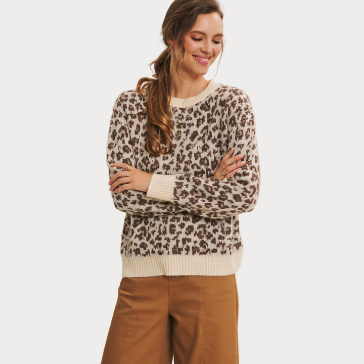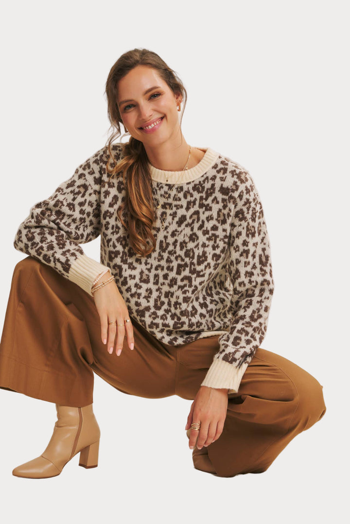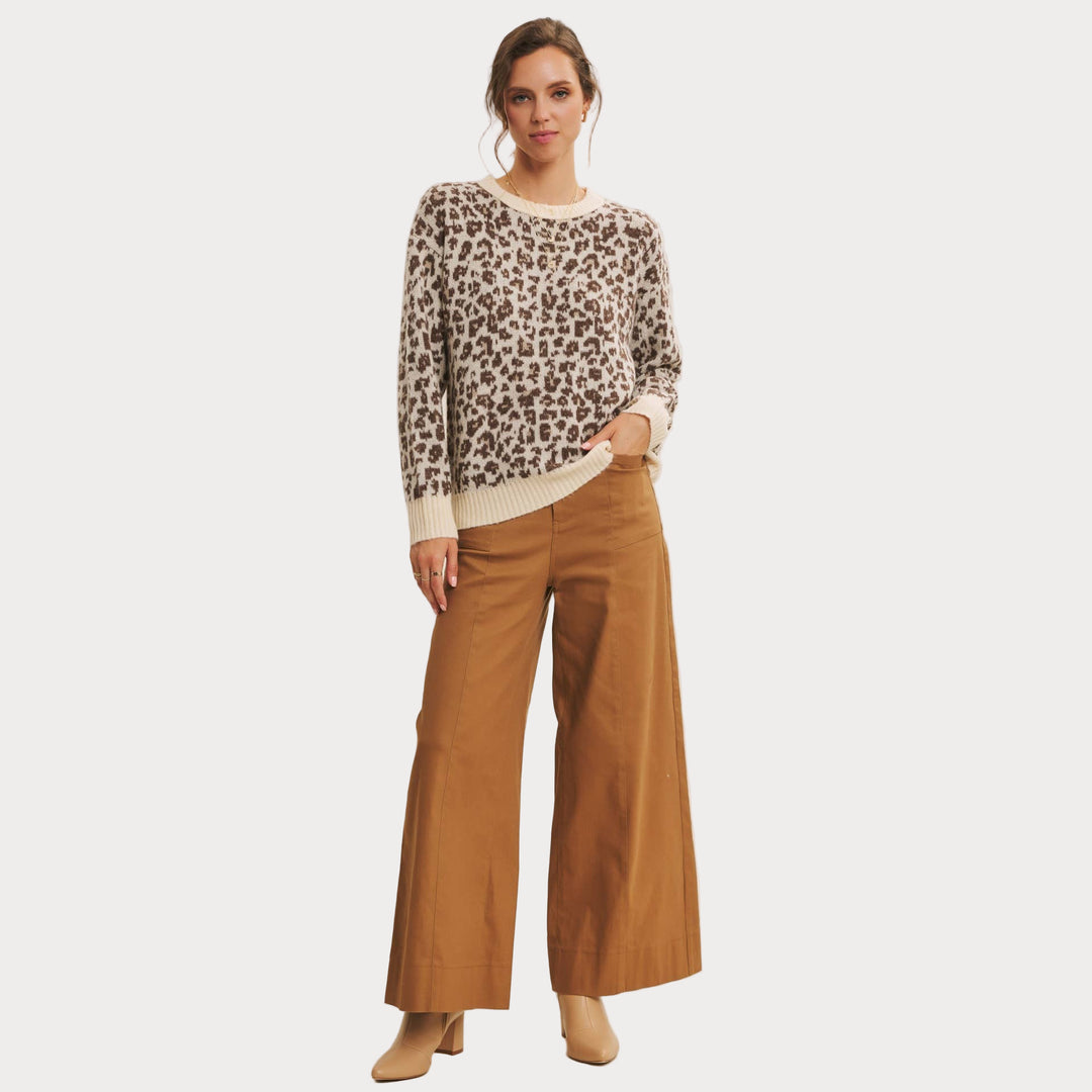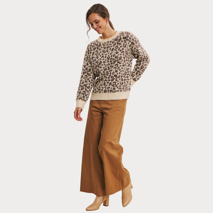 Add a touch of wild charm to your wardrobe with this cozy leopard print sweater. Crafted from soft polyester knit, it features a relaxed fit with ribbed cuffs and hem for everyday comfort. The neutral-toned animal print makes it a versatile statement piece that pairs effortlessly with denim, trousers, or skirts.