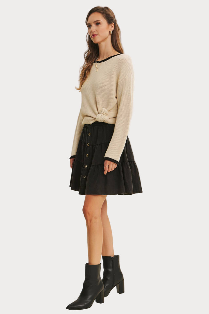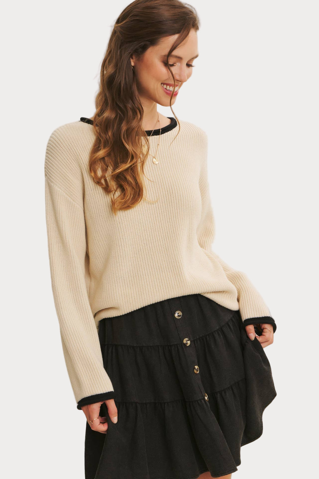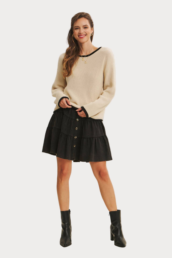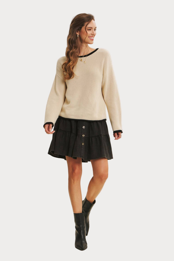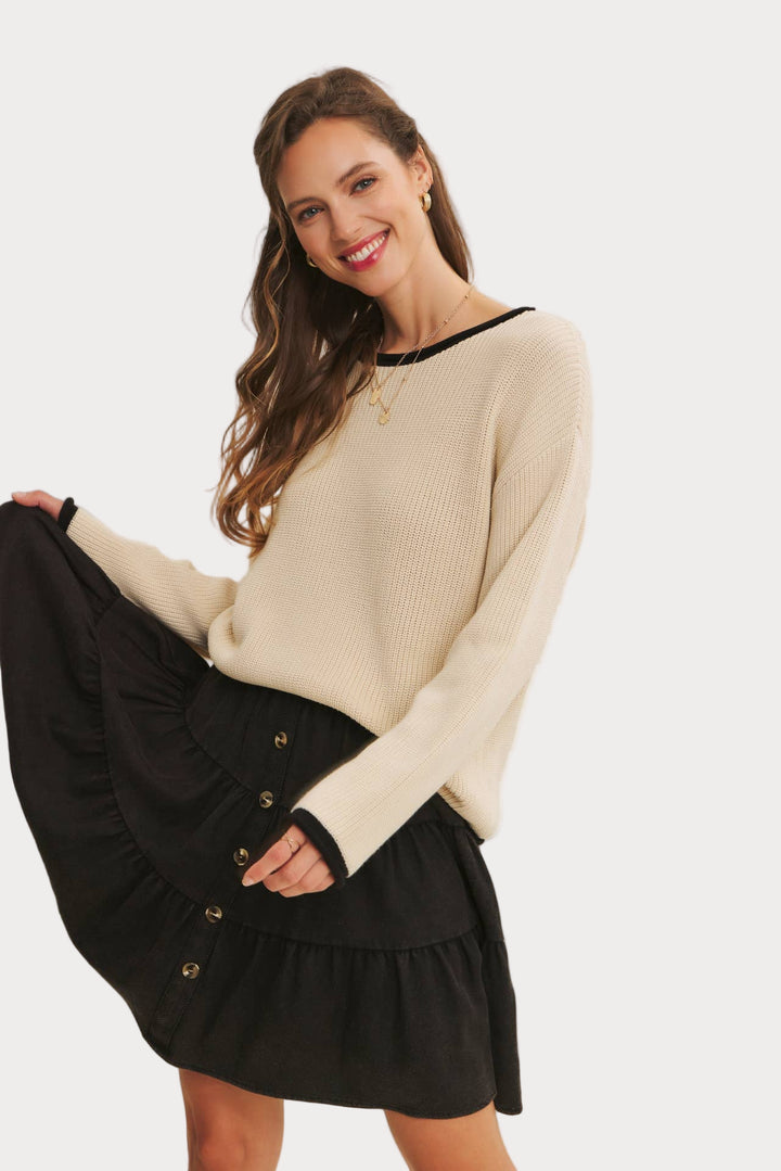 Sleek and versatile, this contrast trim sweater is a timeless knit you’ll reach for again and again. Made from a soft acrylic-cotton blend, it features a relaxed fit with ribbed texture, contrast neckline, and cuffs for just the right pop of detail.