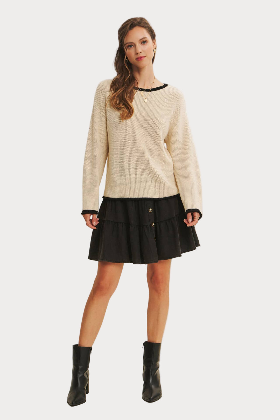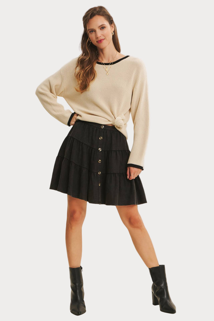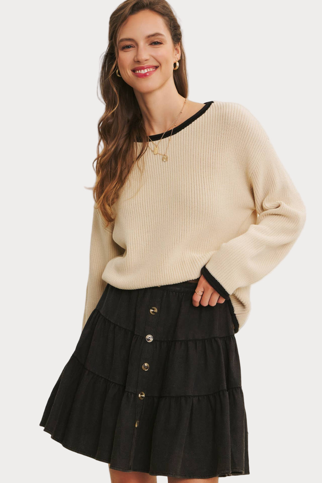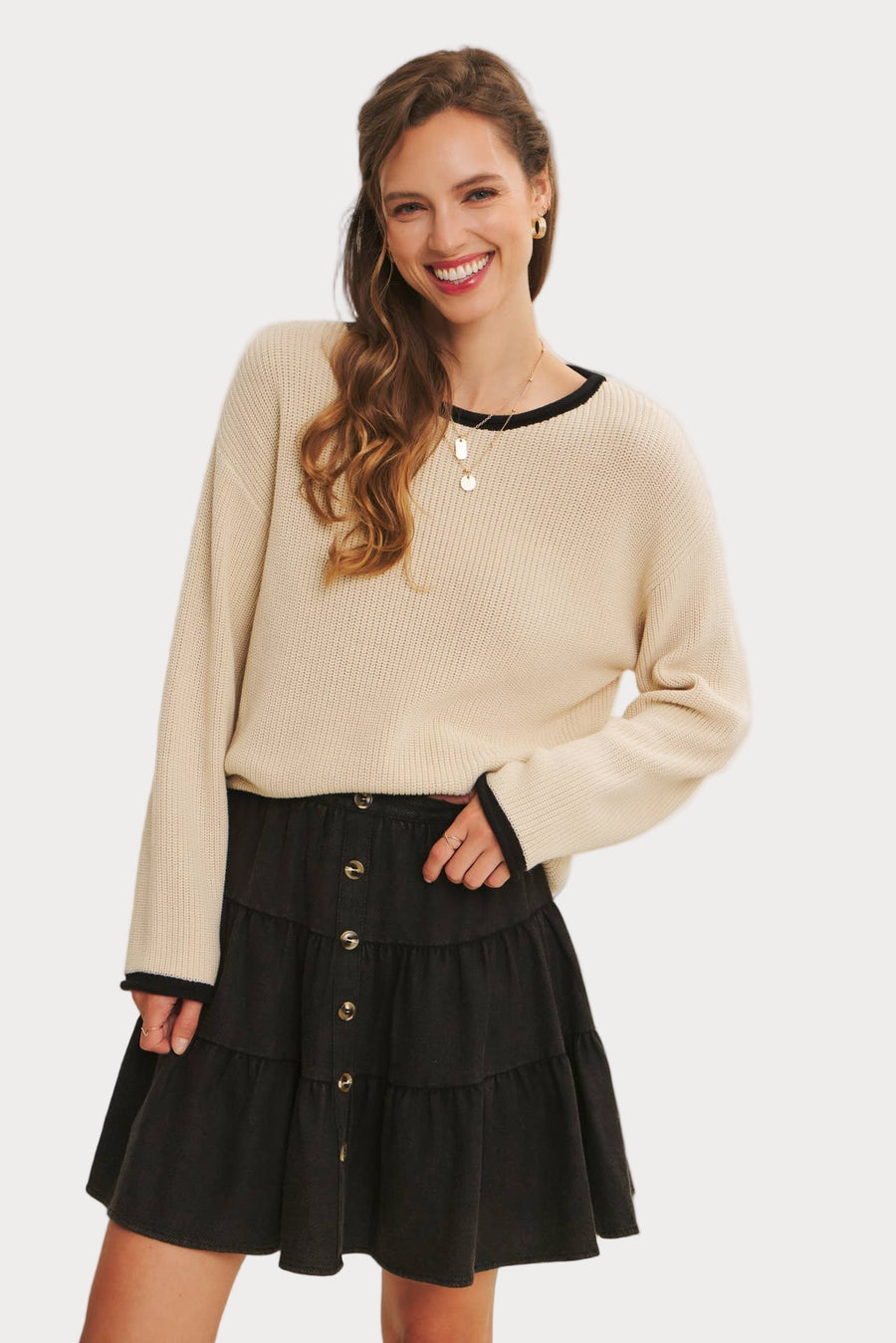 Sleek and versatile, this contrast trim sweater is a timeless knit you’ll reach for again and again. Made from a soft acrylic-cotton blend, it features a relaxed fit with ribbed texture, contrast neckline, and cuffs for just the right pop of detail.