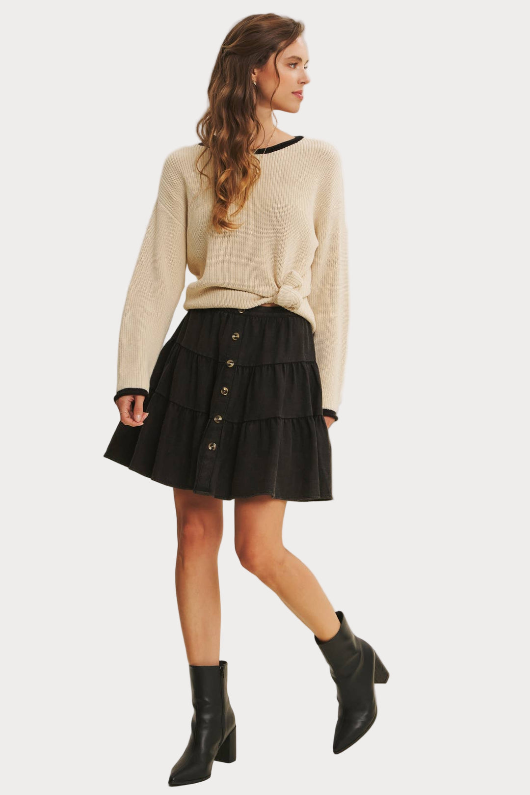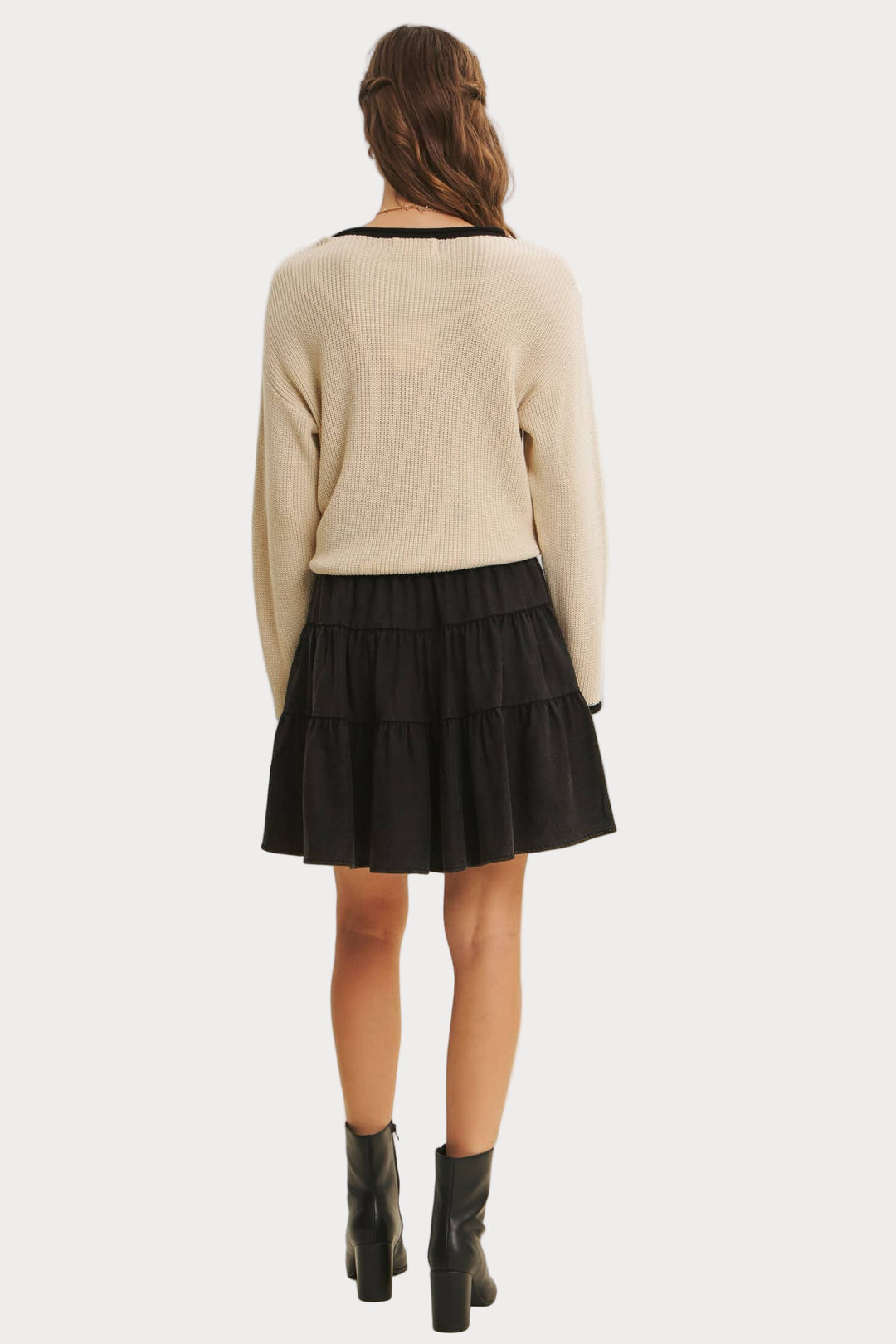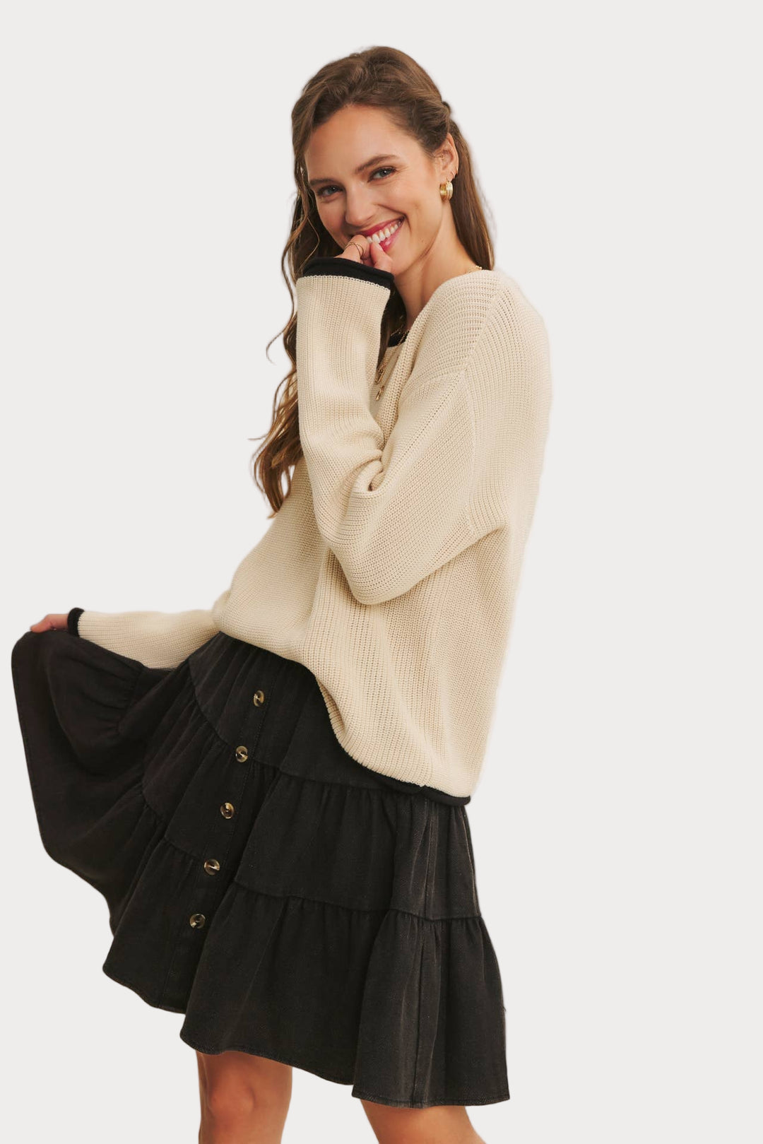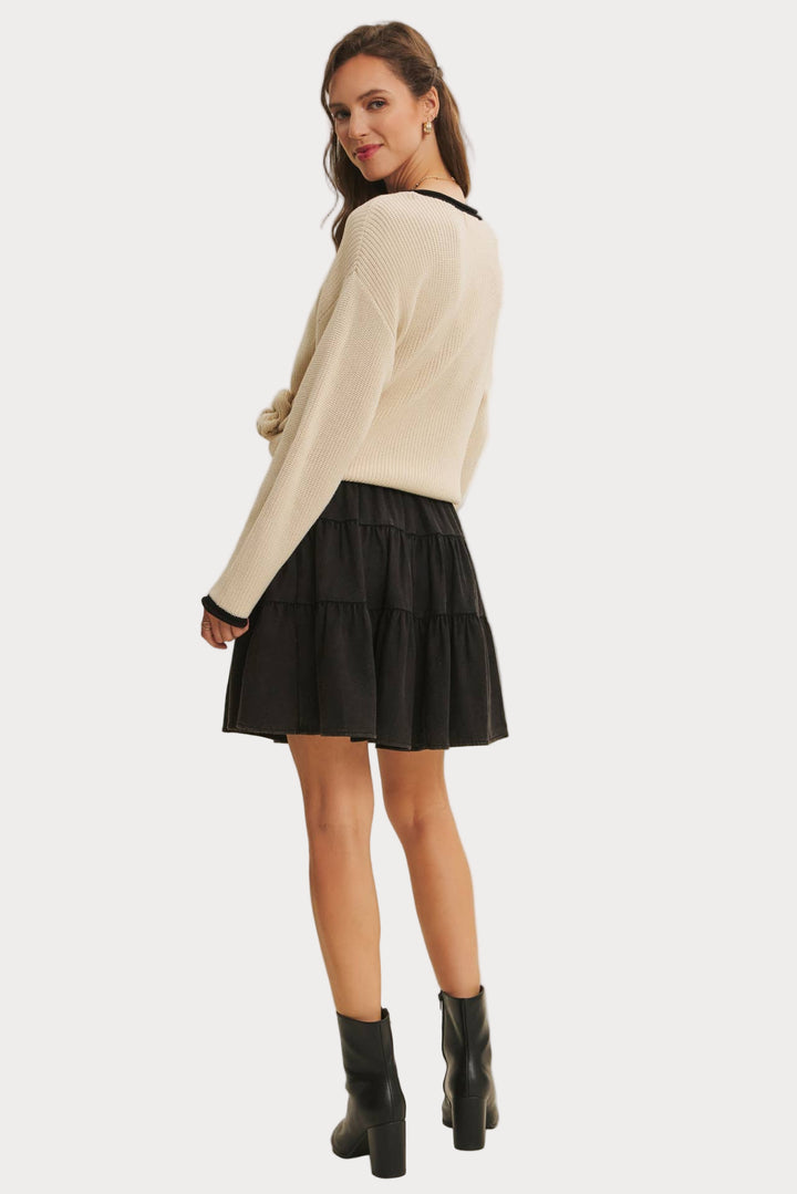 Perfect for pairing with skirts, denim, or layering under jackets, this sweater effortlessly balances casual comfort with modern polish. A wardrobe essential that transitions seamlessly across seasons.