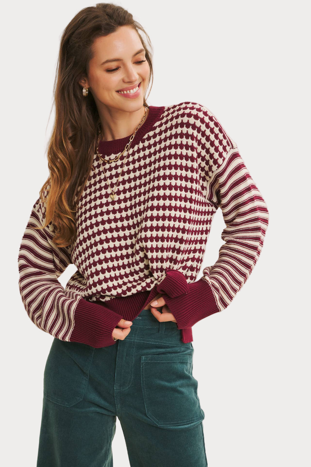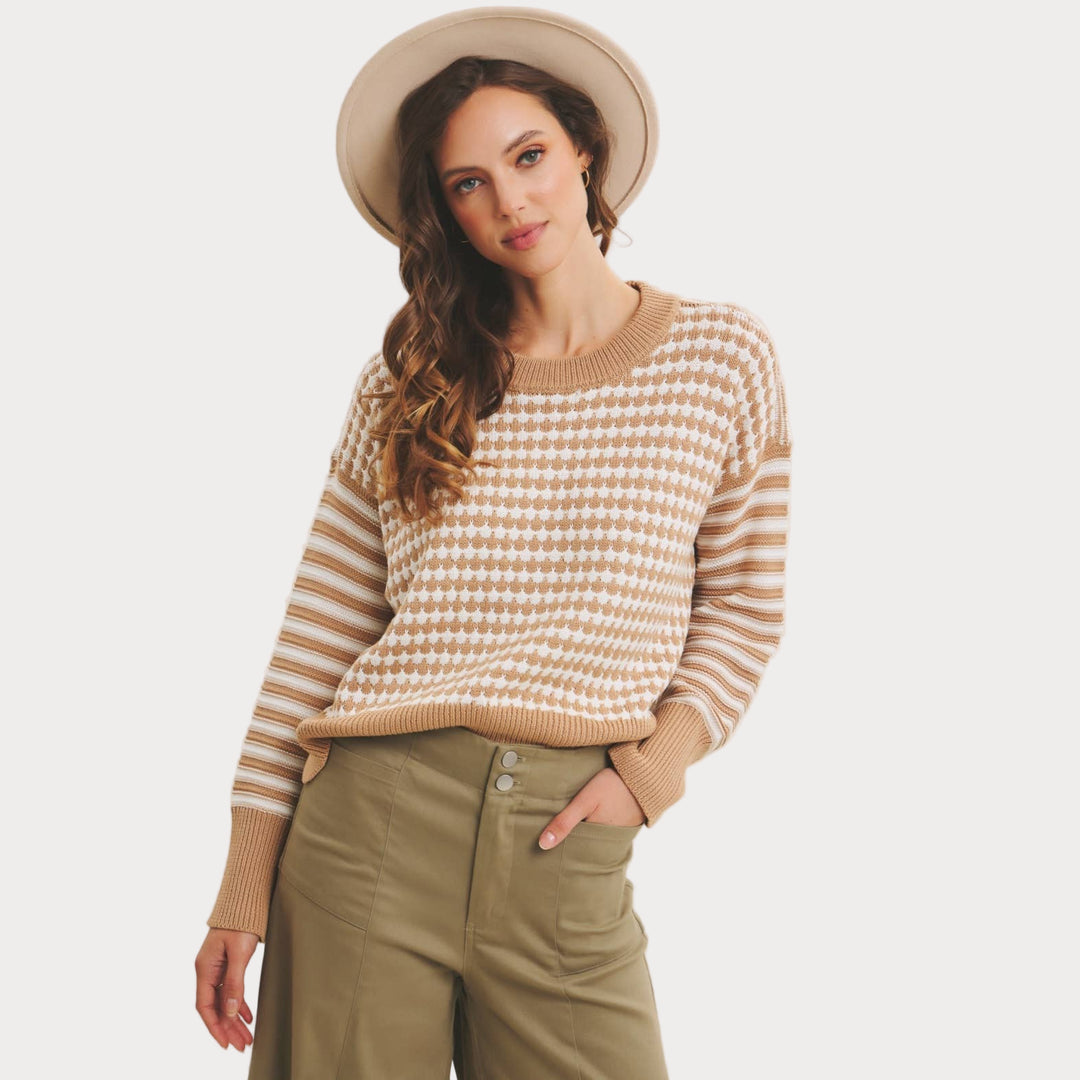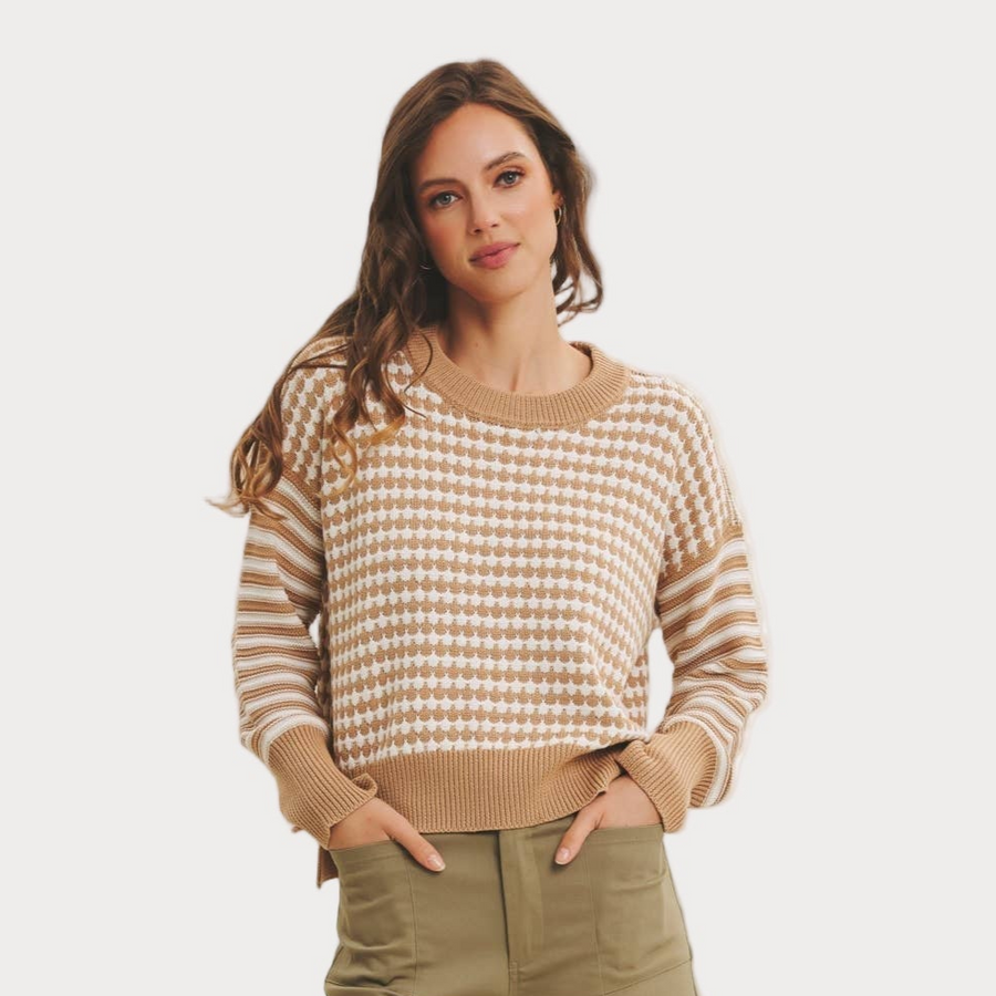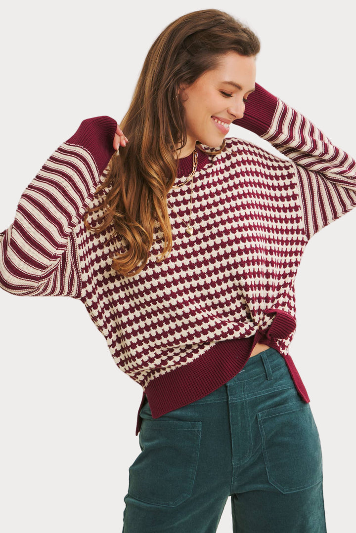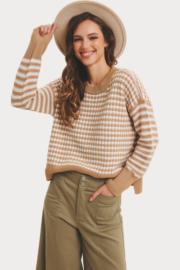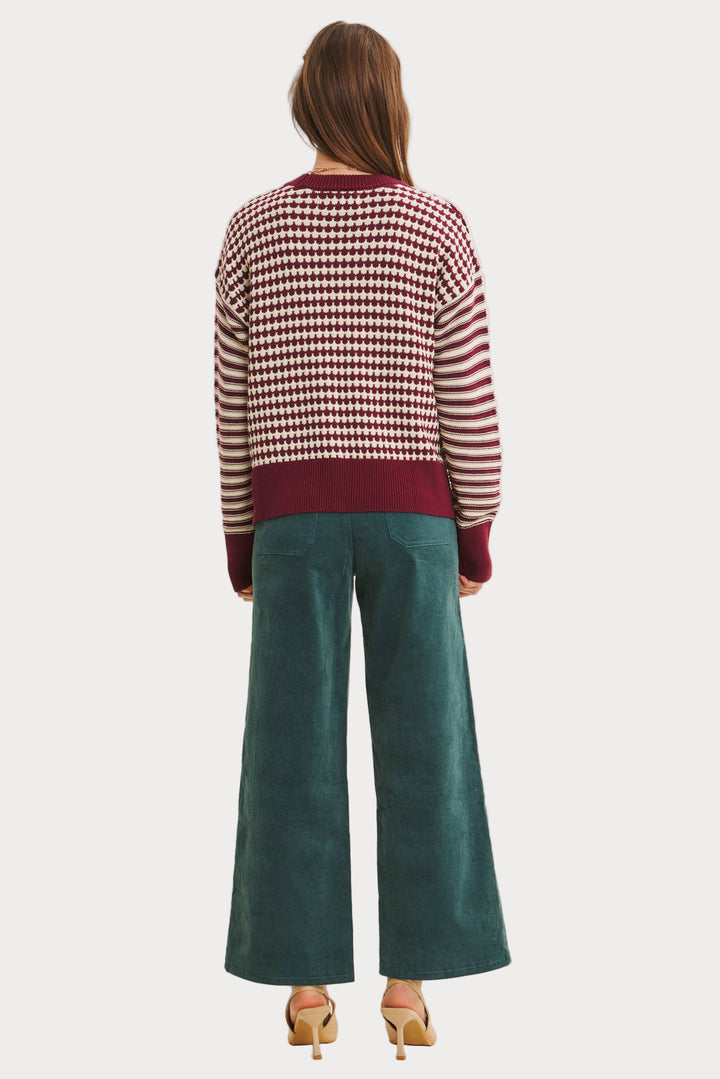 Add a playful twist to your knitwear collection with this contrast sleeve sweater. Crafted from a soft blend of acrylic and cotton, it combines cozy comfort with eye-catching design. Featuring a patterned knit body, striped long sleeves, and ribbed trim, it’s the perfect balance of classic and modern style.