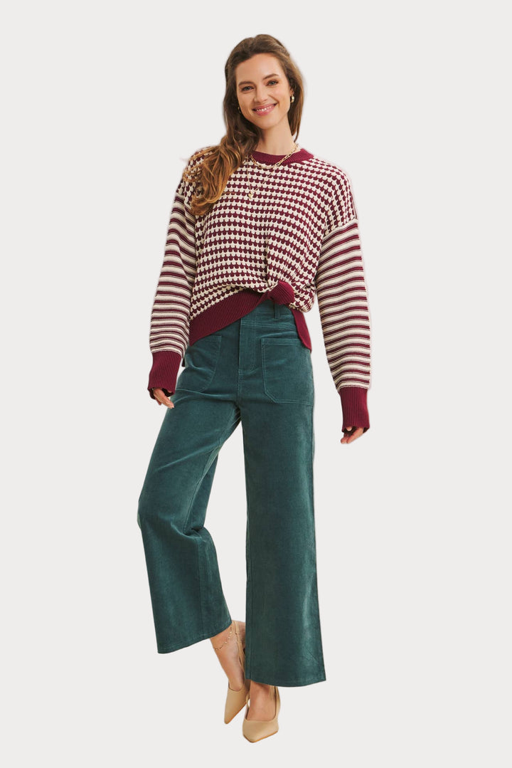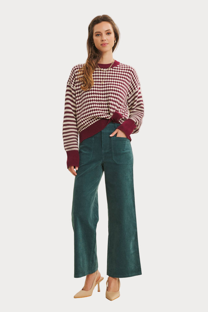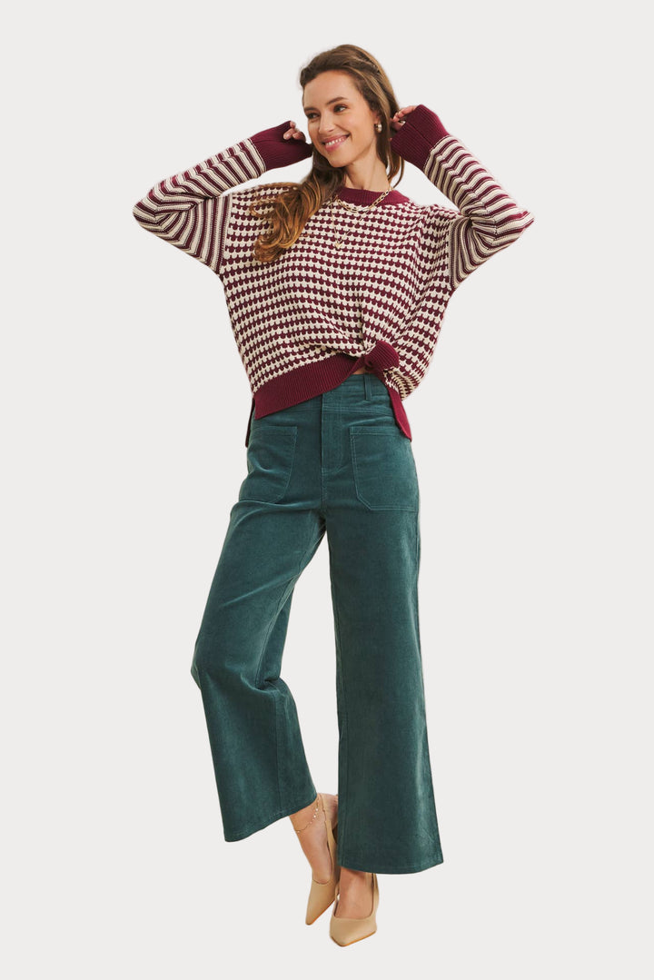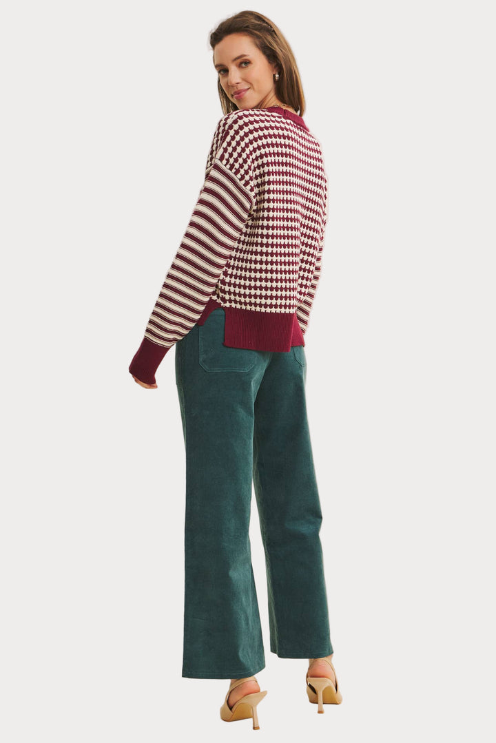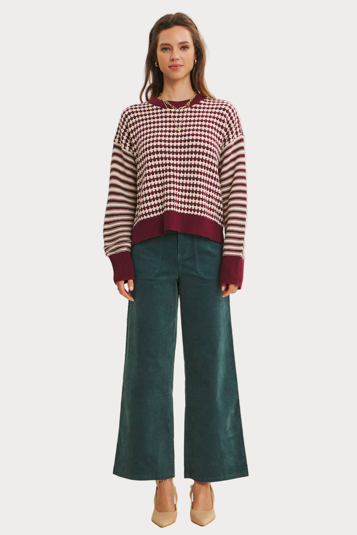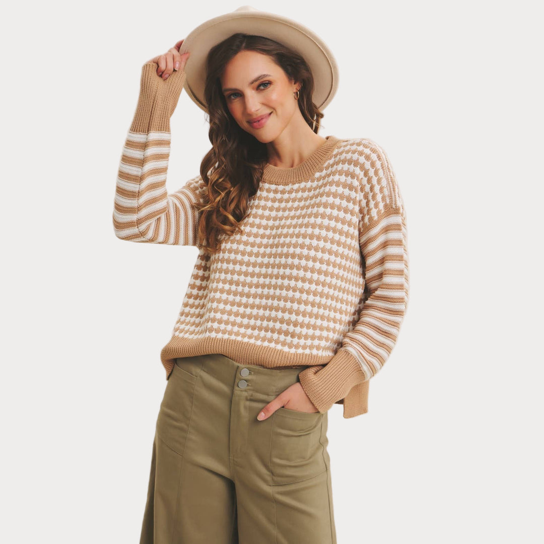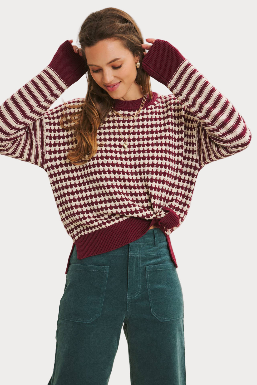Add a playful twist to your knitwear collection with this contrast sleeve sweater. Crafted from a soft blend of acrylic and cotton, it combines cozy comfort with eye-catching design. Featuring a patterned knit body, striped long sleeves, and ribbed trim, it’s the perfect balance of classic and modern style.