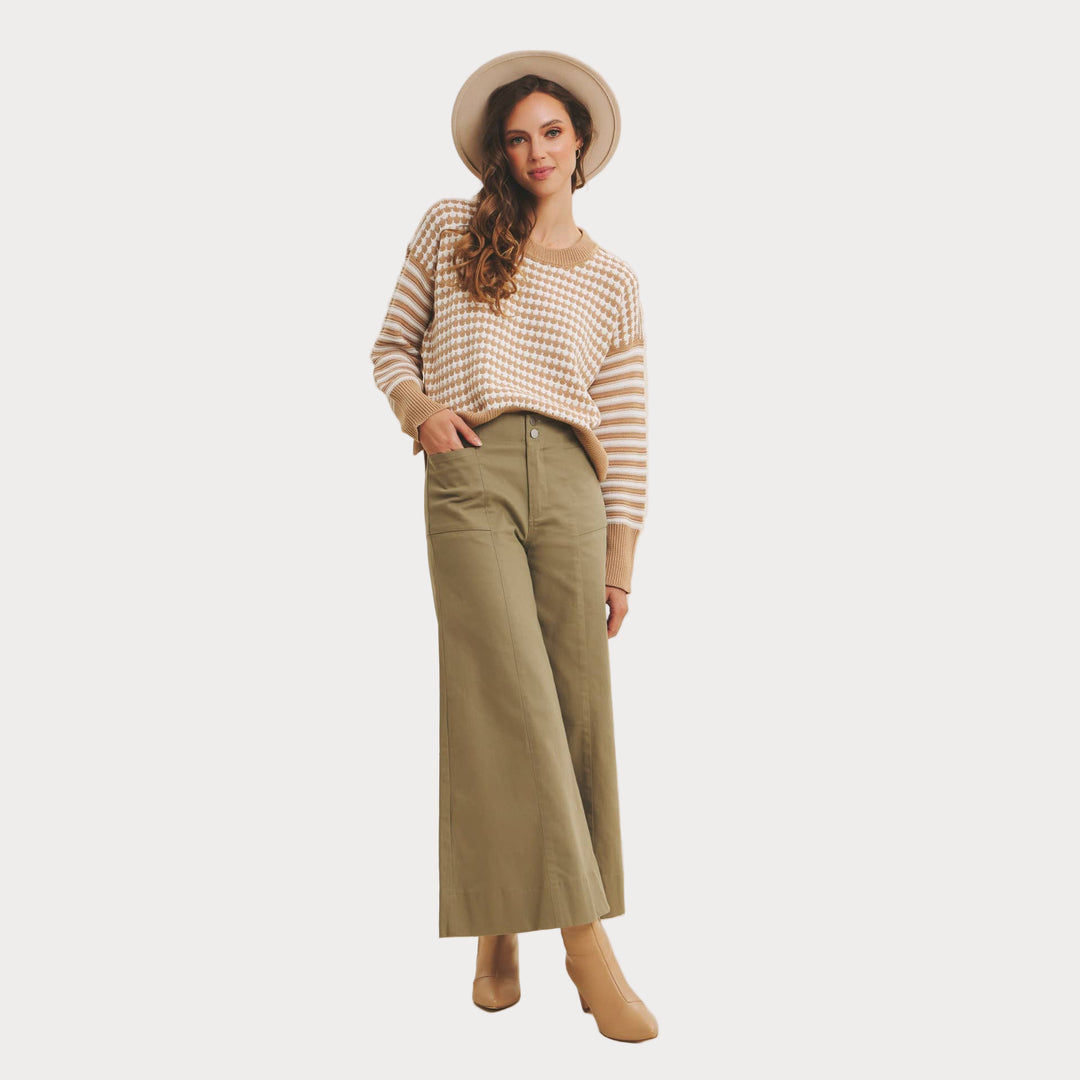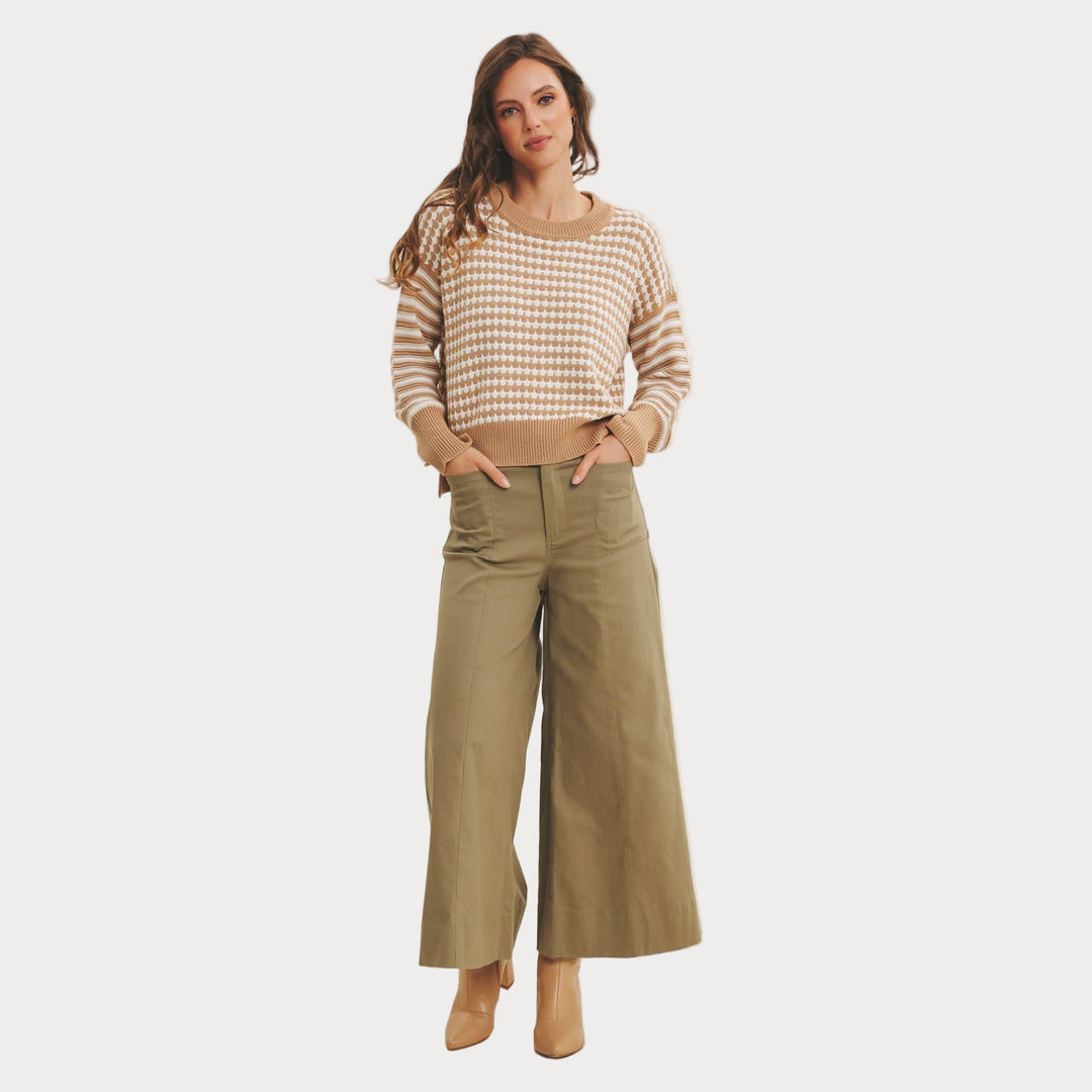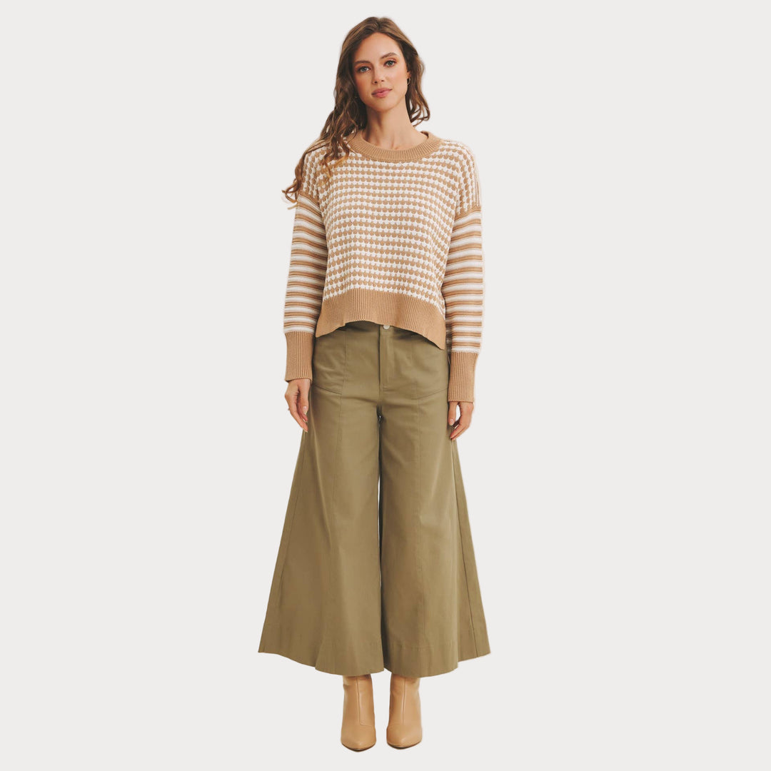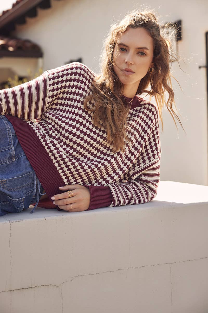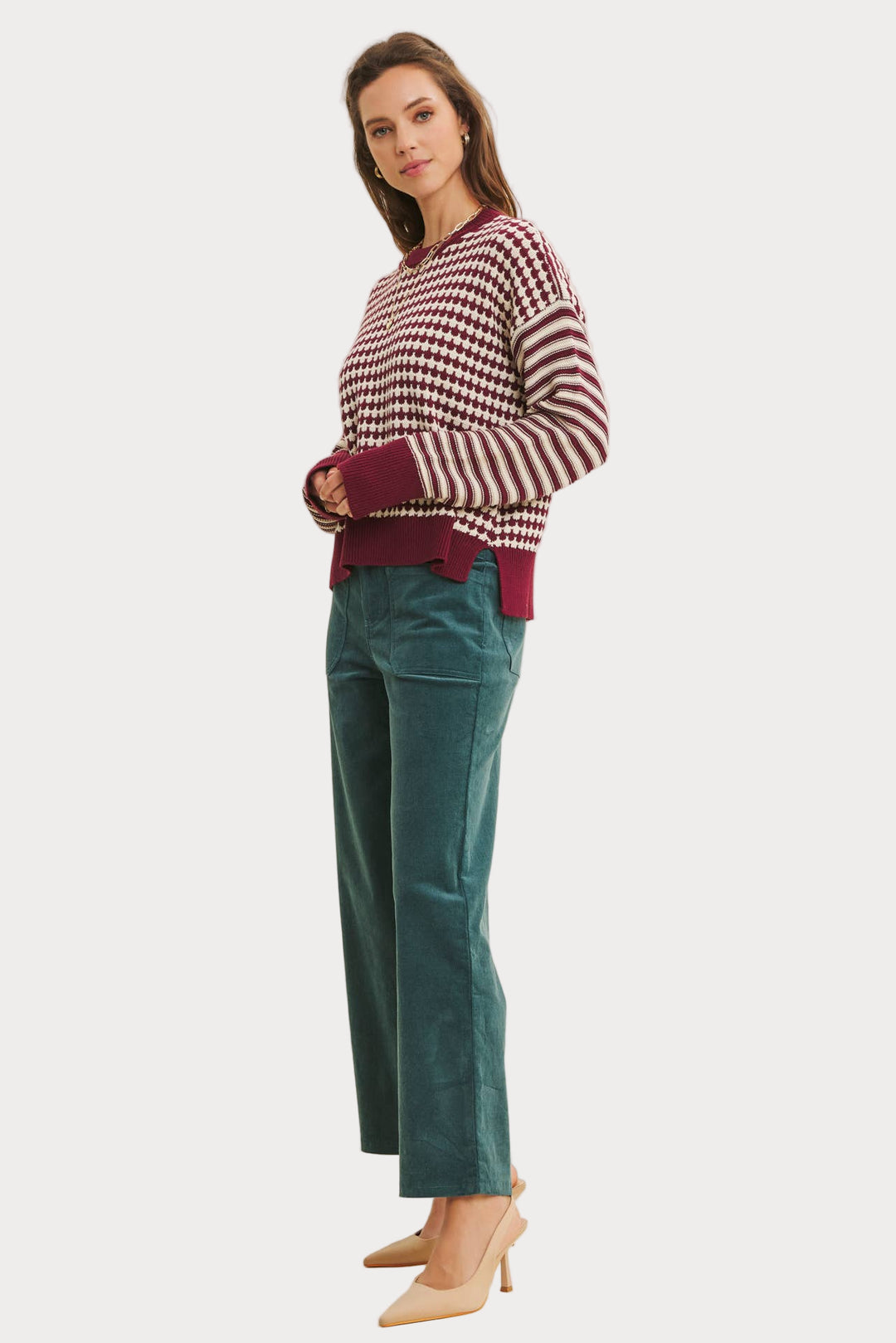 Add a playful twist to your knitwear collection with this contrast sleeve sweater. Crafted from a soft blend of acrylic and cotton, it combines cozy comfort with eye-catching design. Featuring a patterned knit body, striped long sleeves, and ribbed trim, it’s the perfect balance of classic and modern style.