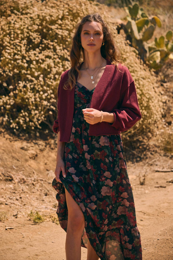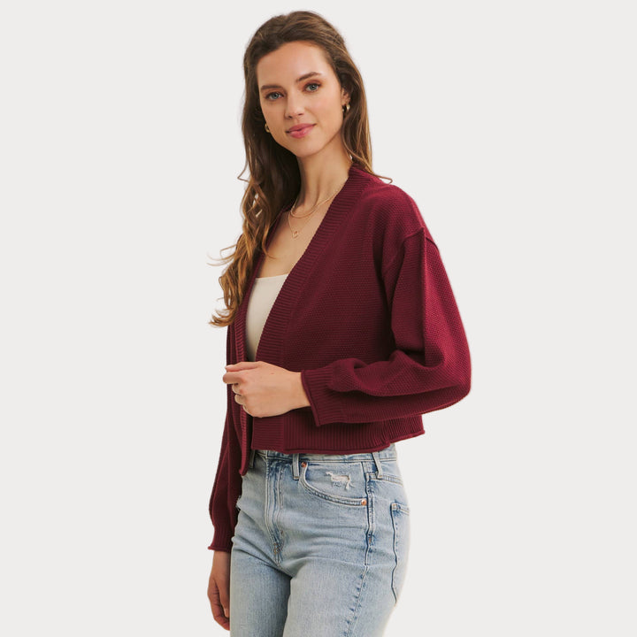 Waffle Knit Balloon Sleeve Cardigan | Cropped Sweater