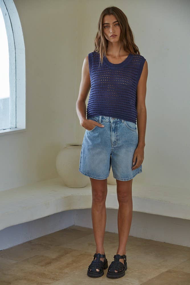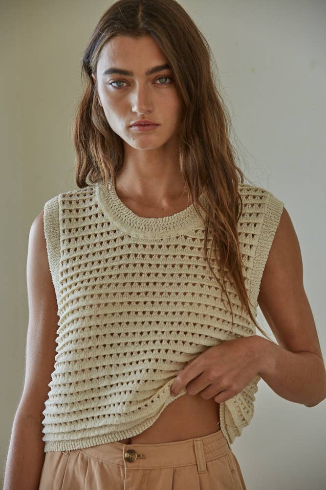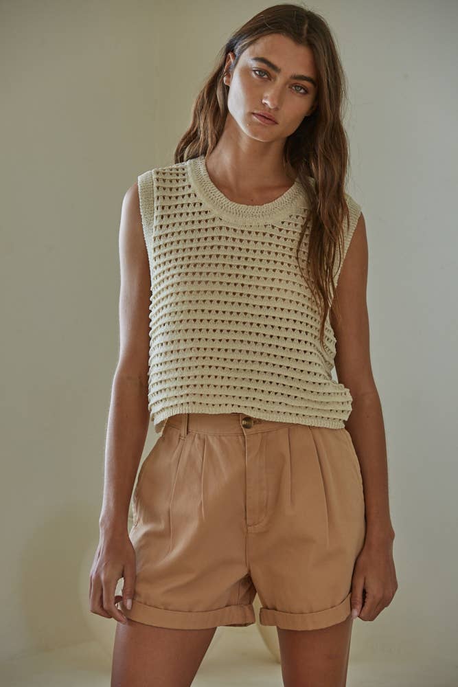 Natural crochet knit sleeveless vest with round neck, paired with shorts for a relaxed summer outfit.