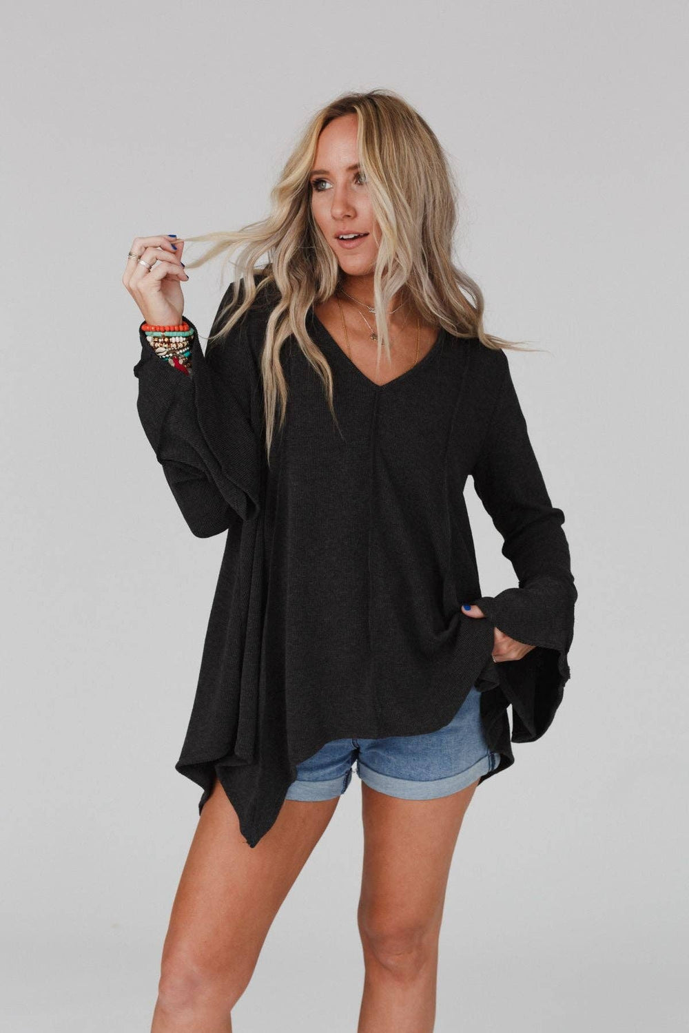 Elevate your wardrobe with the Golden Hour Long Bell Sleeve Top in Charcoal. This enchanting piece exudes boho vibes, perfect for festivals or casual outings.