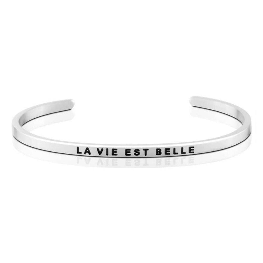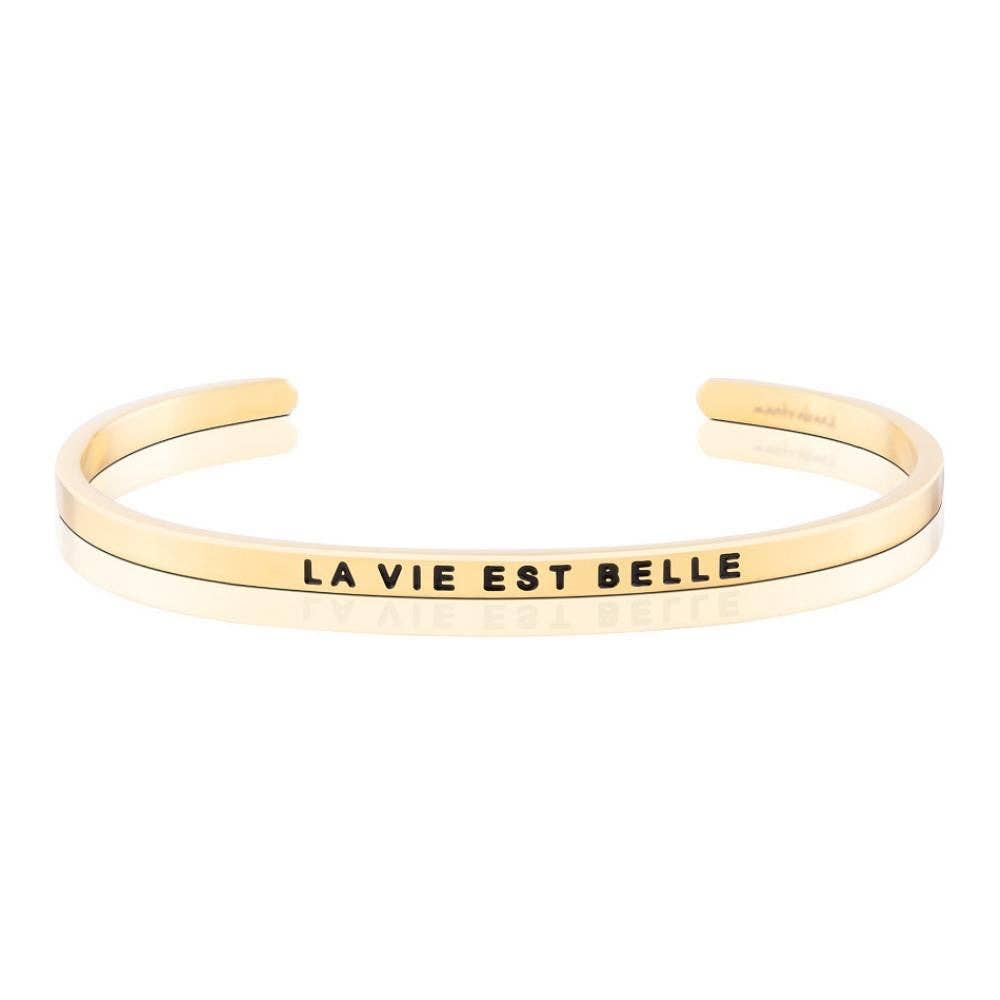 Embrace the beauty of life with the La Vie Est Belle bracelet. Crafted from durable stainless steel, this fully adjustable piece is designed to fit most wrists comfortably. With its 18K gold or rose gold dip, it radiates elegance while remaining lead-free, nickel-free, and hypoallergenic. Authentic from MantraBand, it's not only delicate but built to last a lifetime with a lifetime guarantee against breakage. Wear this ideal happiness bracelet as a reminder to find joy in every moment and share your philosophy with the world.