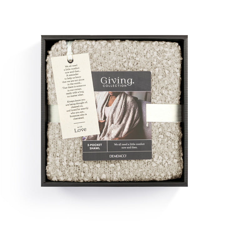 Introducing the Charcoal Giving Shawl, a perfect blend of comfort and thoughtfulness. Featuring a rich charcoal colour, this shawl showcases a unique textured fabric that envelops you in warm-hearted softness.