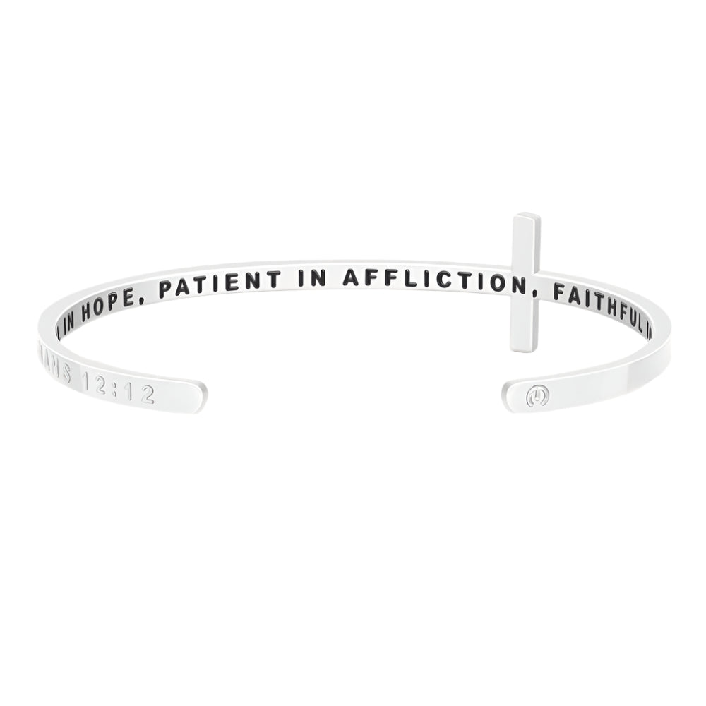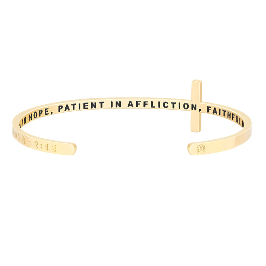 Be joyful in hope, patient in affliction, faithful in prayer. Romans 12:12 Size Fully adjustable, one size fits most. Material Stainless steel. Lead free, nickel free, hypoallergenic, tarnish resistant. Gold & rose gold bracelets are 18K gold dipped.