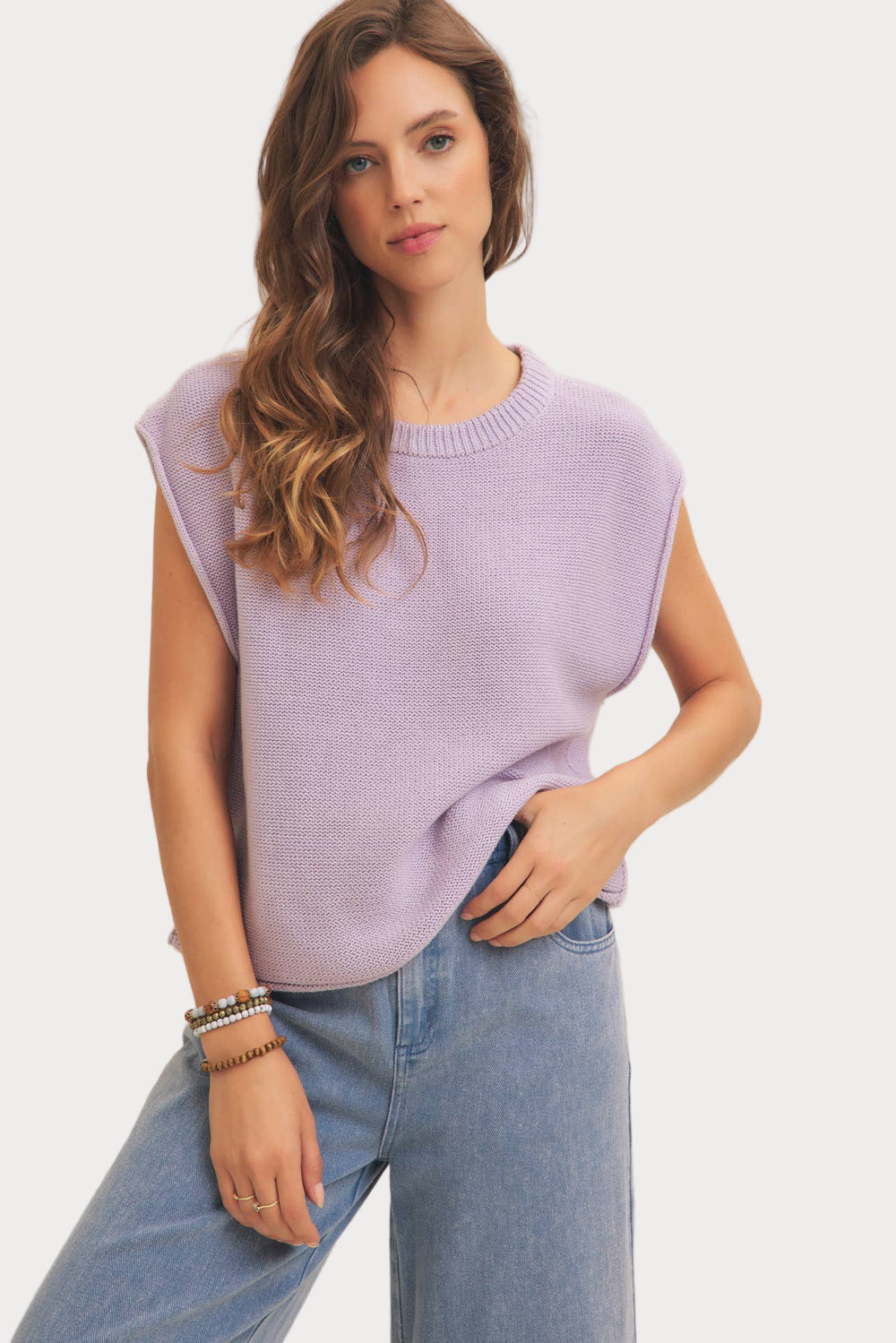 Elevate your wardrobe with our Loose Fit Exposed Seam Cotton Knit Sweater Vest Top. Designed for ultimate comfort, it features rolled edges on the sleeves and hem, a classic round neck, and a relaxed silhouette.