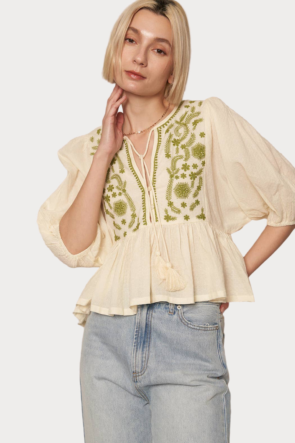 Embrace a romantic, bohemian spirit with our embroidered peplum blouse. Featuring intricate sage green embroidery, a charming tie-neck with tassels, and airy puff sleeves. The perfect top for effortless, everyday style.
