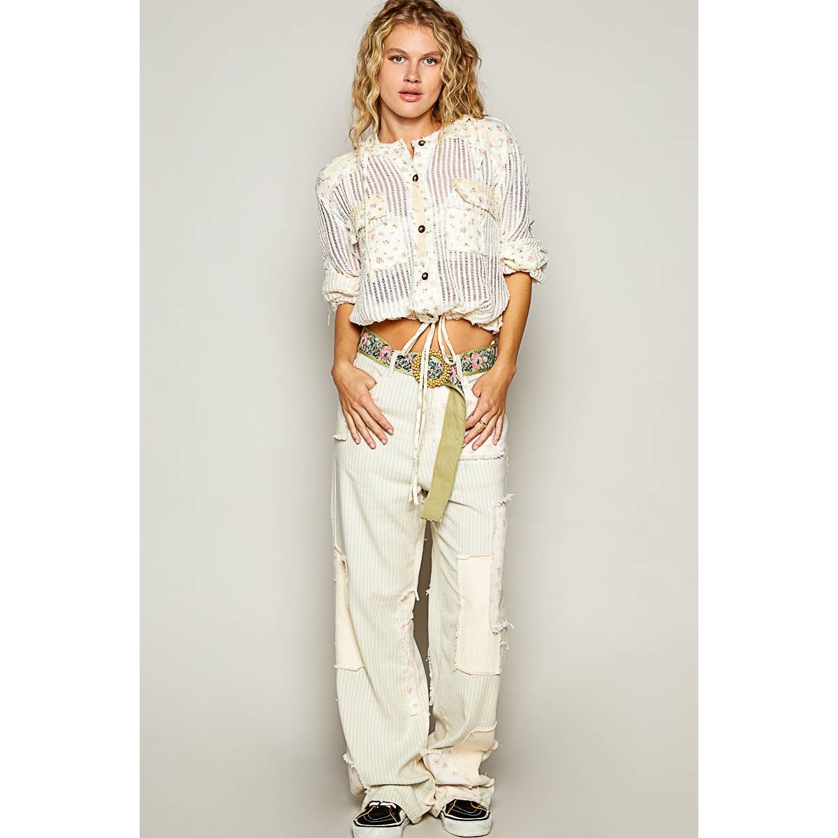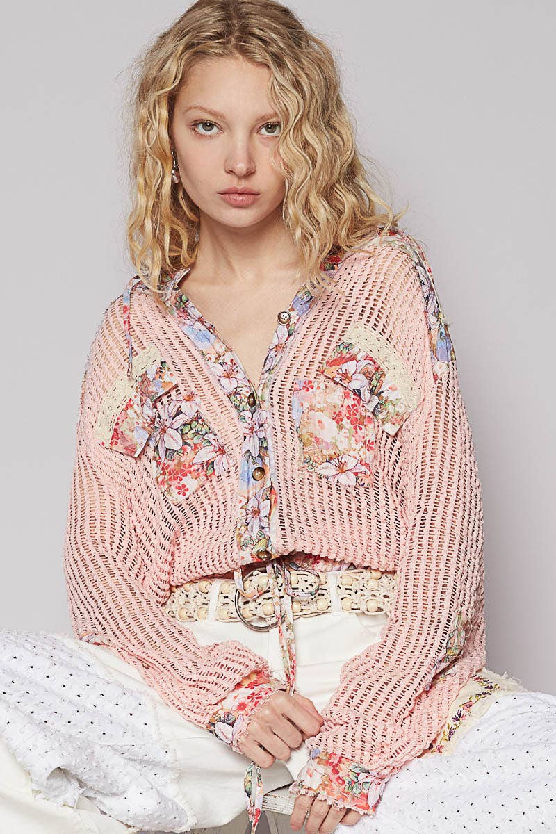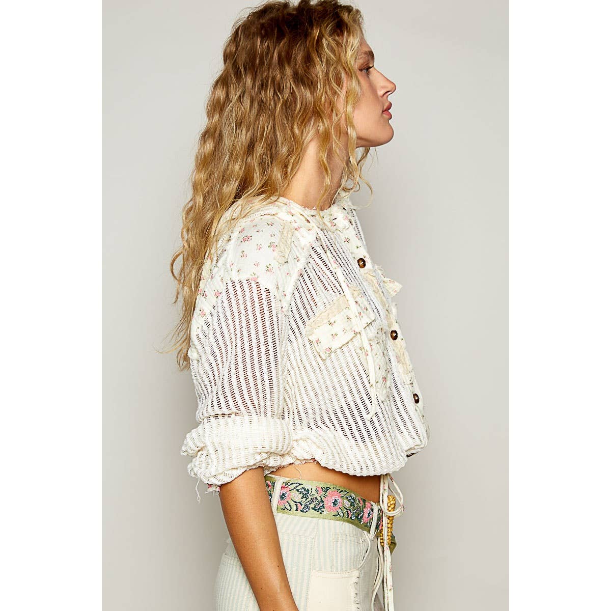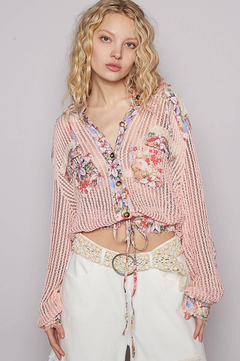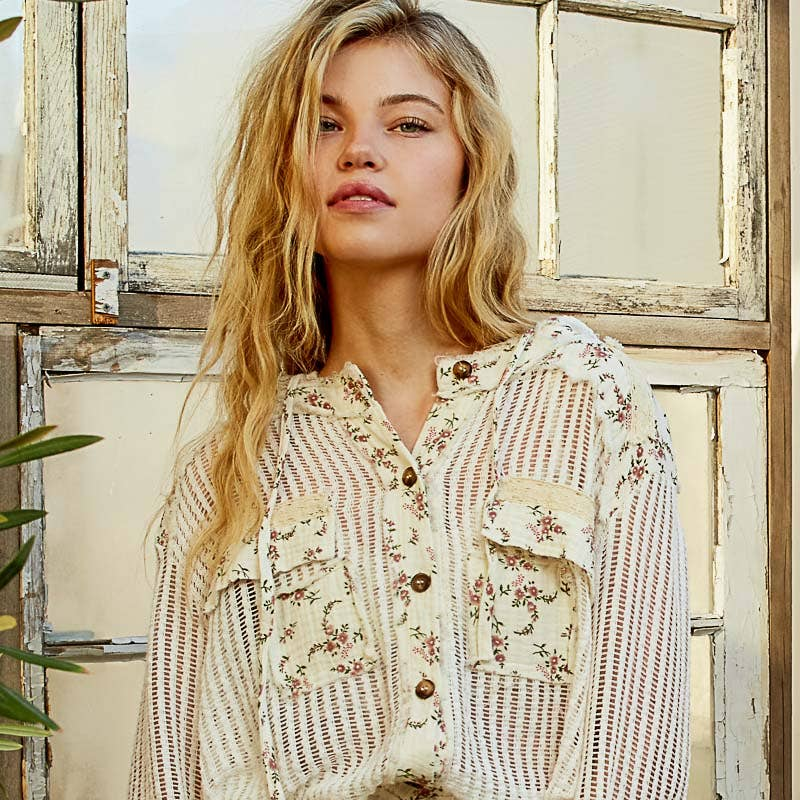 Elevate your bohemian style with this mesh button-up top featuring delicate floral patchwork accents, front pockets, and a lightweight, breathable design—perfect for layering in spring and summer.