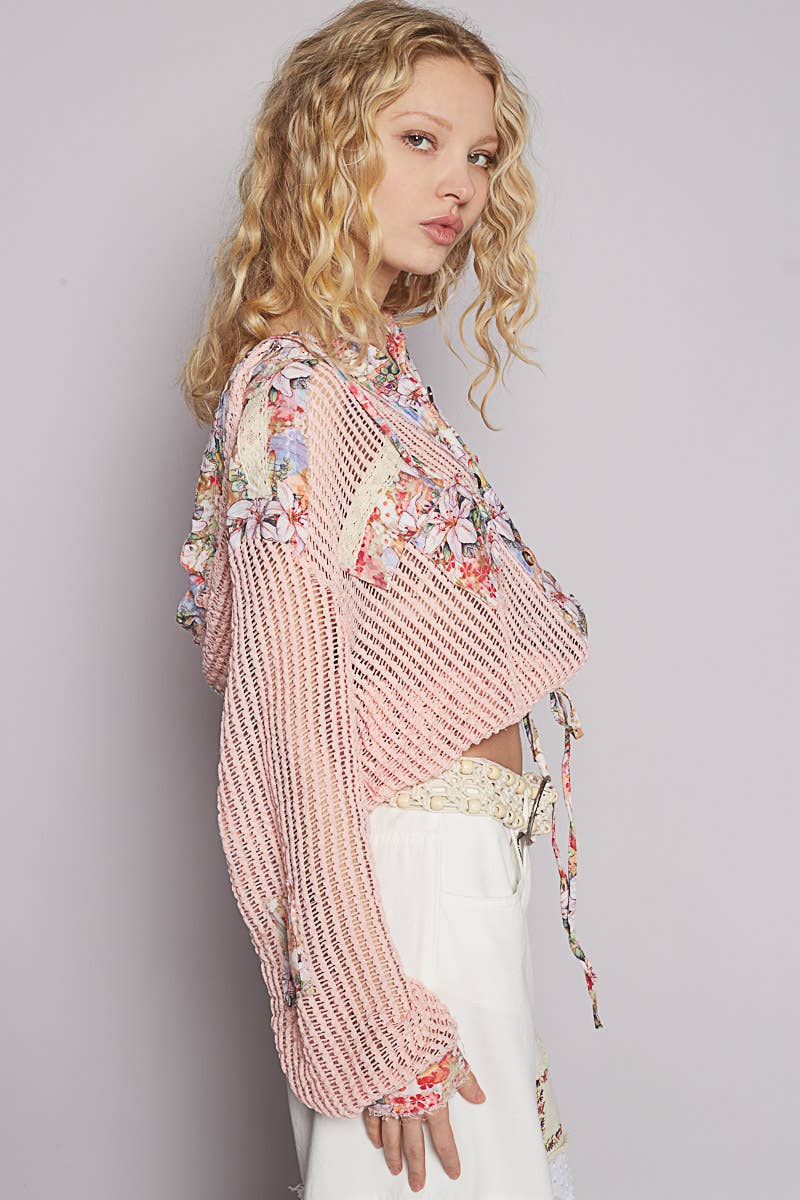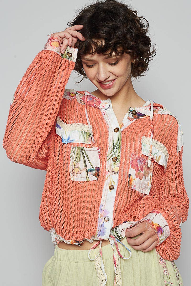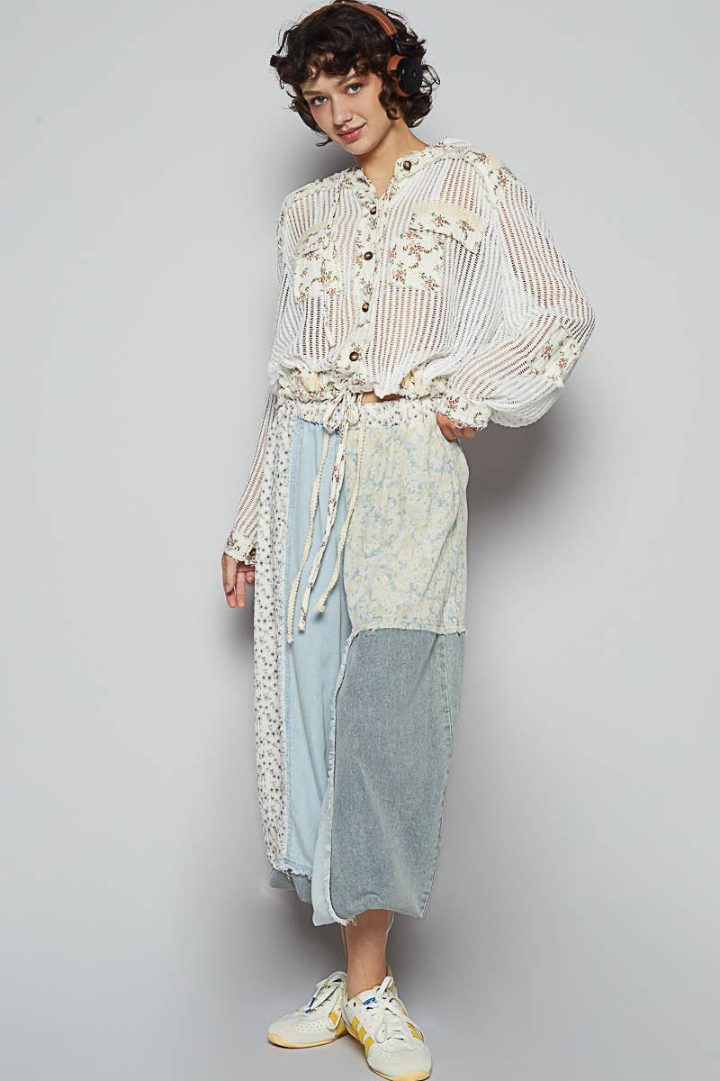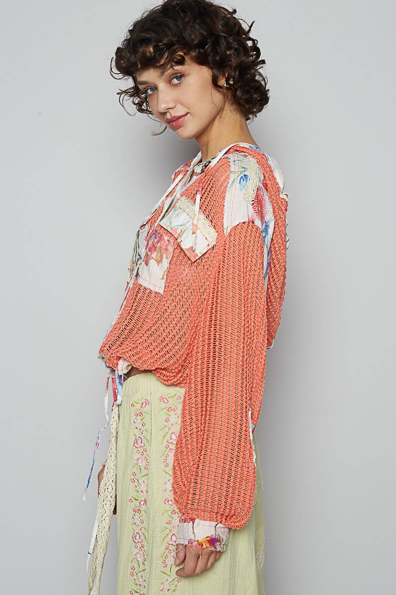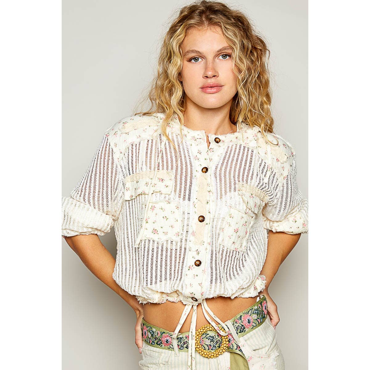 Elevate your bohemian style with this mesh button-up top featuring delicate floral patchwork accents, front pockets, and a lightweight, breathable design—perfect for layering in spring and summer.